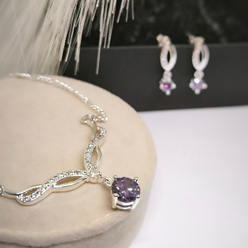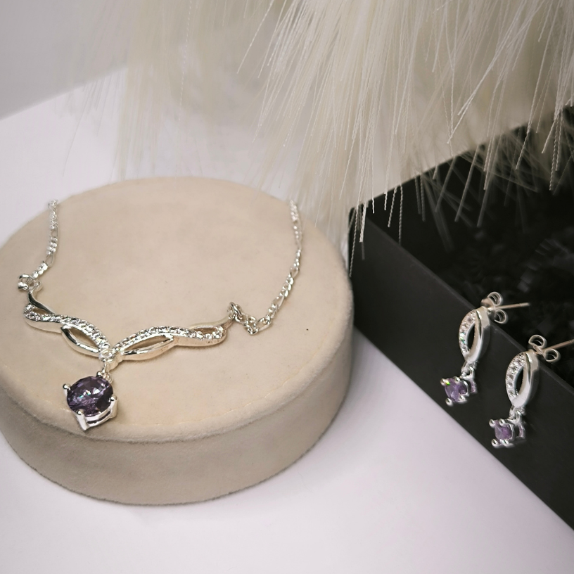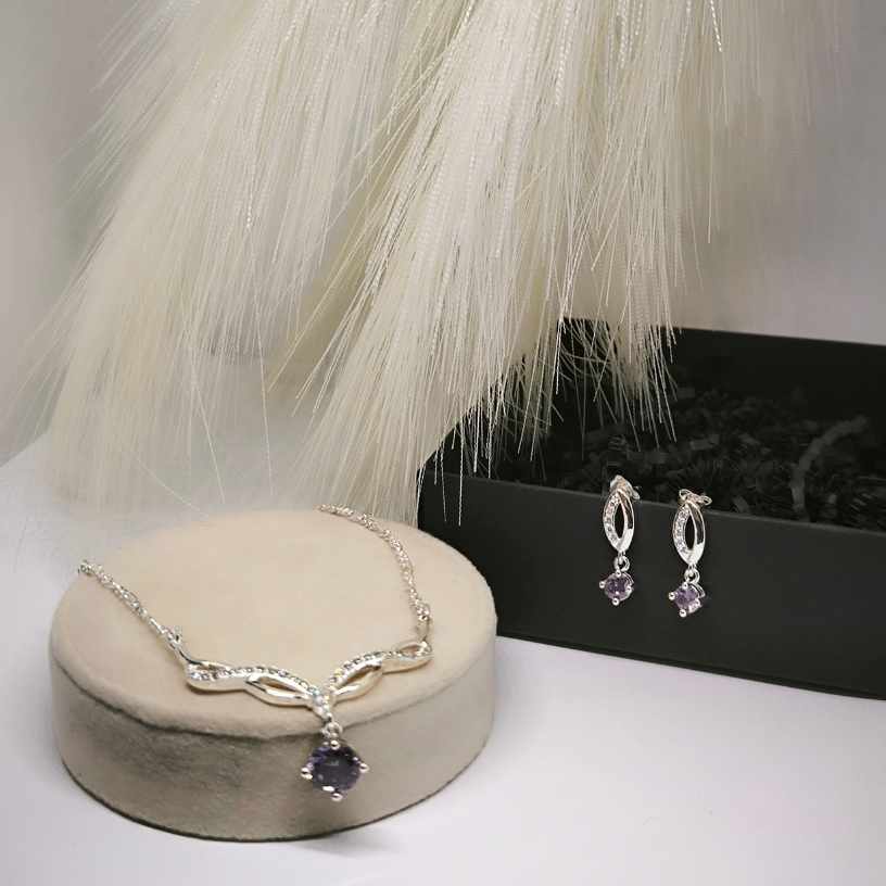 See imeline naistele mõeldud ehete komplekt koosneb kaelakeest ja kõrvarõngastest, mis sobivad omavahel suurepäraselt. Iga ehe on kaunistatud purpurse värvi kristallidega, mis annavad komplektile erilise võlu ja luksuse. 🌟