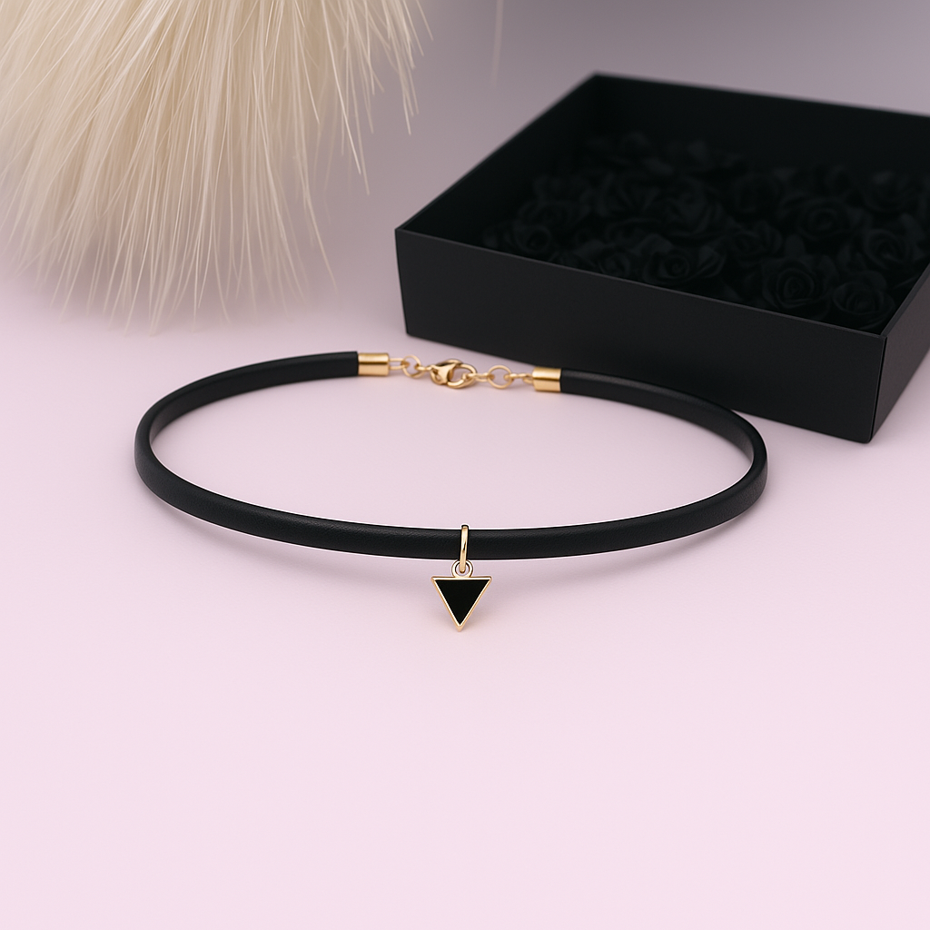 See choker stiilis kaelakee on ideaalne valik, et luua julge, ainulaadne ja rafineeritud välimus. Kolmnurkne ripats lisab salapära ja sümboliseerib tasakaalu ning harmooniat. Kontrastne musta ja kuldse värvi kombinatsioon võimaldab aksessuaari hõlpsalt sobitada erinevate riietusstiilidega – alates gootikast kuni luksusliku klassikani.