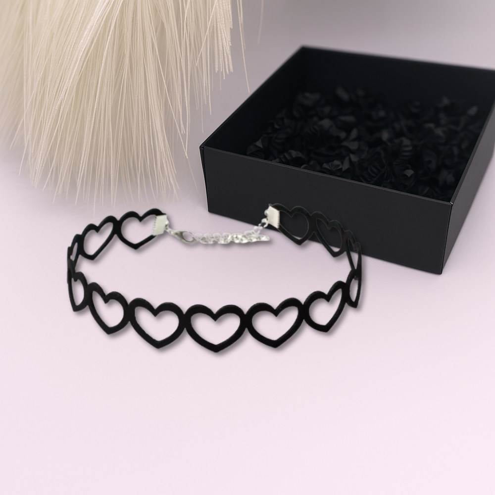 ❤️ Käekett „Südamed Tants“ – see on väljendusrikas choker-stiilis aksessuaar, mis rõhutab sinu unikaalset stiili ja romantilist vaimu. Mustade südamete muster lisab sellele kaelakeele mängulisust, peenet julgust ja elegantsi üheskoos.
