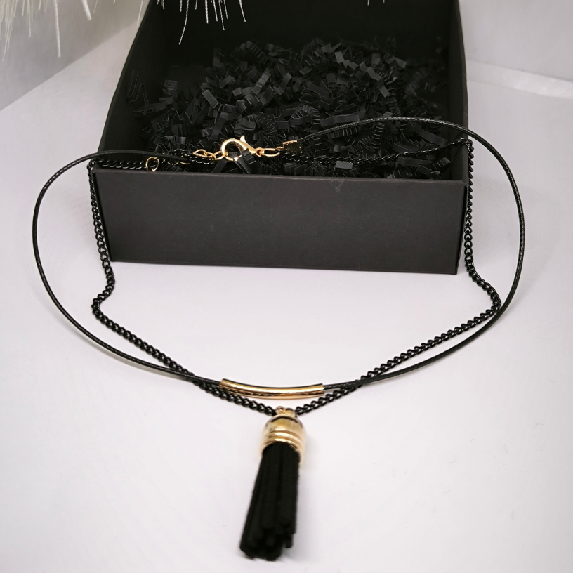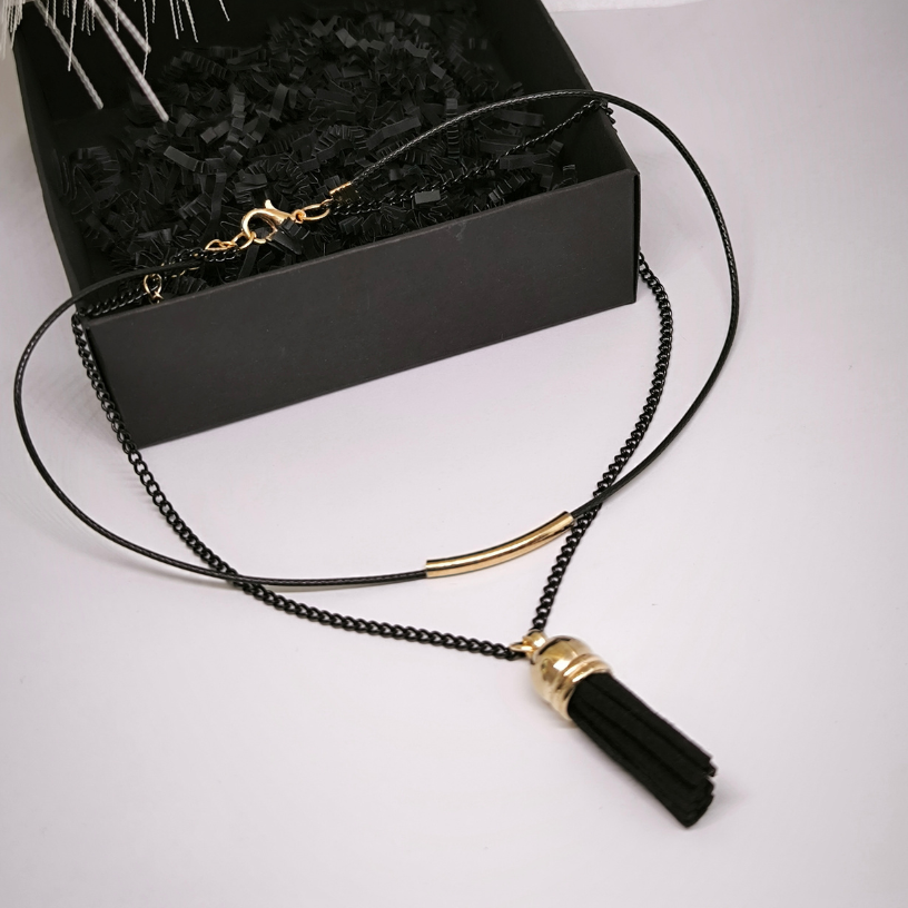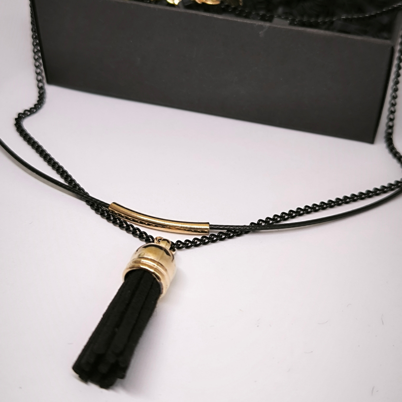 🌟 Kahekordne boheemlasliku stiili kaelakee – see on unikaalne aksessuaar, mis täiustab teie igapäevast välimust ja lisab sellele erilisust. 👗 See ehe koosneb lõigatud naharibadest, mis täidavad tavalise metallripatsi funktsiooni, ja metallidest detailidest, mis lisavad ehtesse luksust. Must värv koos kuldsete elementidega loob kontrastse ja stiilse kombinatsiooni, mis sobib eriti hästi sügavamate dekolteedega rõivaste juurde. 💎