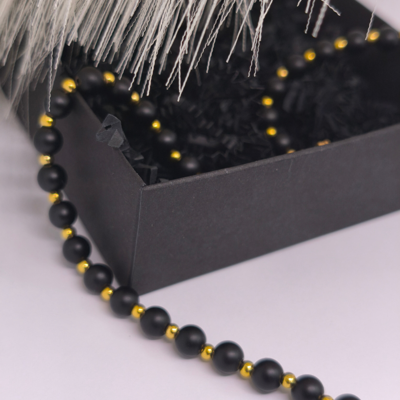 ✔️ Kuldsete detailidega – harmoneeruvad õrnalt mustade helmestega ja loovad luksusliku mulje.