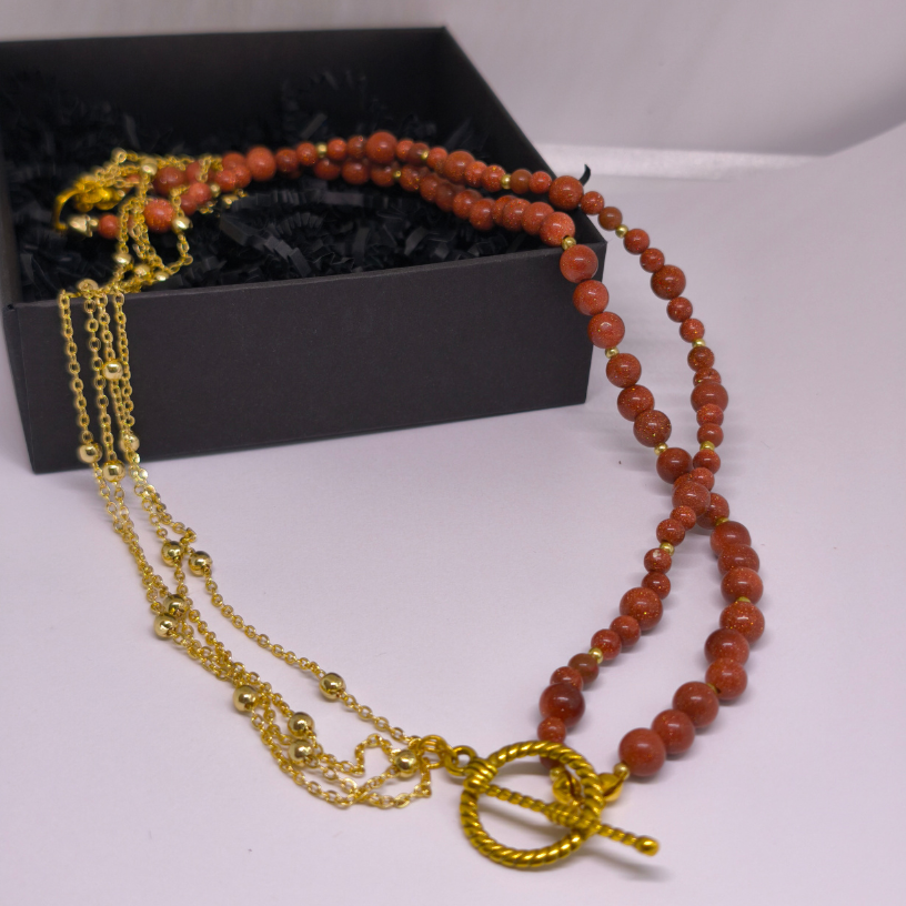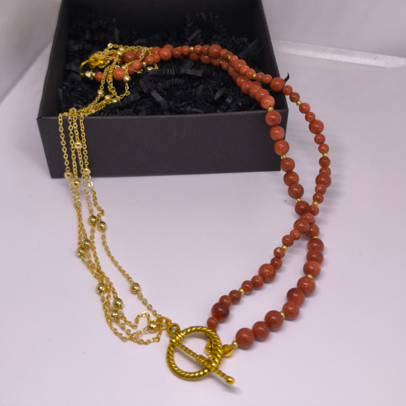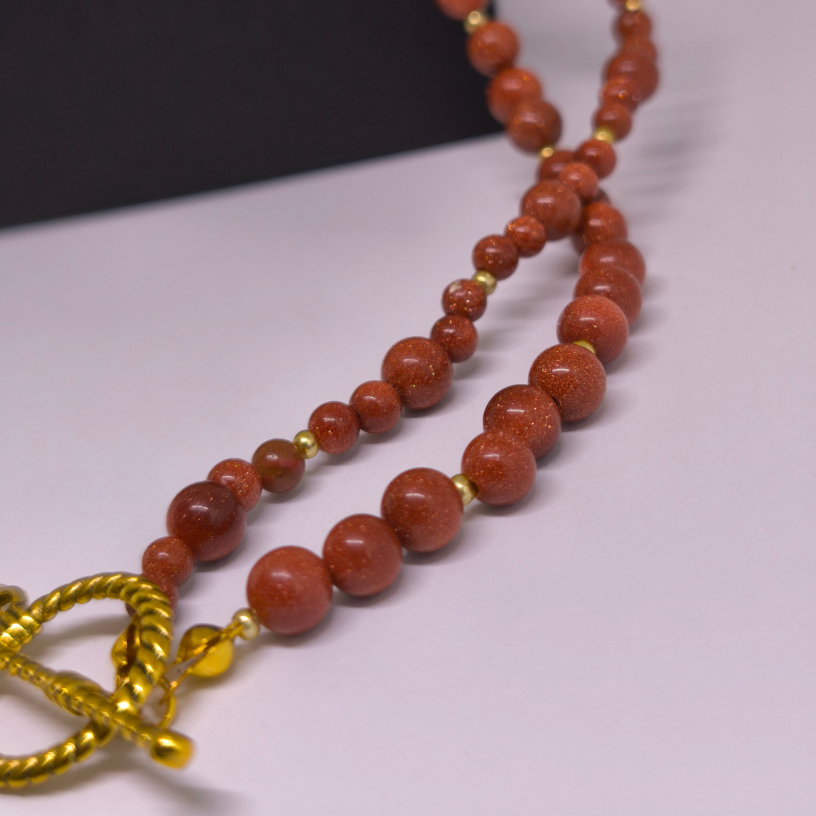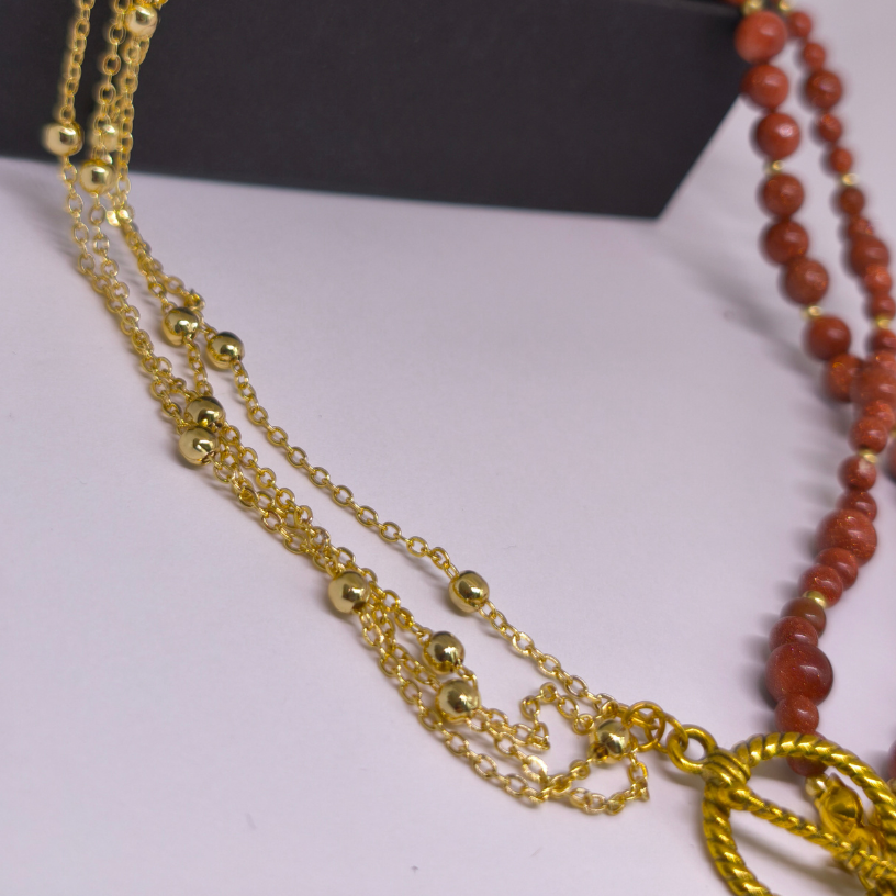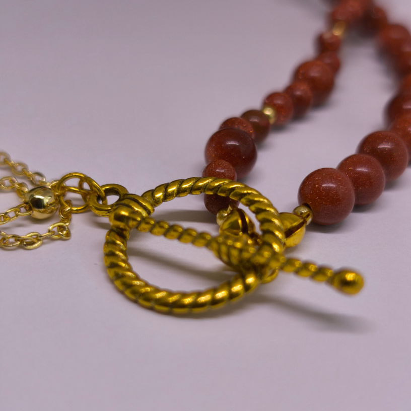 🌞 Rõngutööna valminud kaelakee „Kuldne koidik“ – see on ainulaadne ja luksuslik aksessuaar, valmistatud päikesekivist, mis särab peene kuldse varjundiga. Päikesekivi on iidsetest aegadest peetud elujõu, õnne ja edu sümboliks, seega see kaelakee mitte ainult ei kaunista, vaid annab ka positiivset energiat.