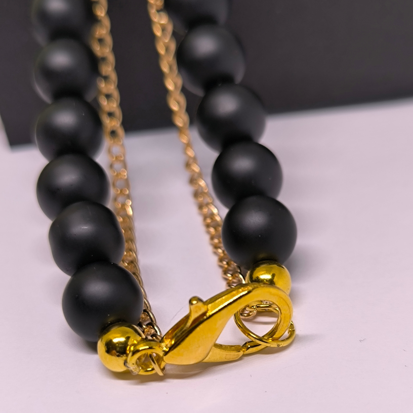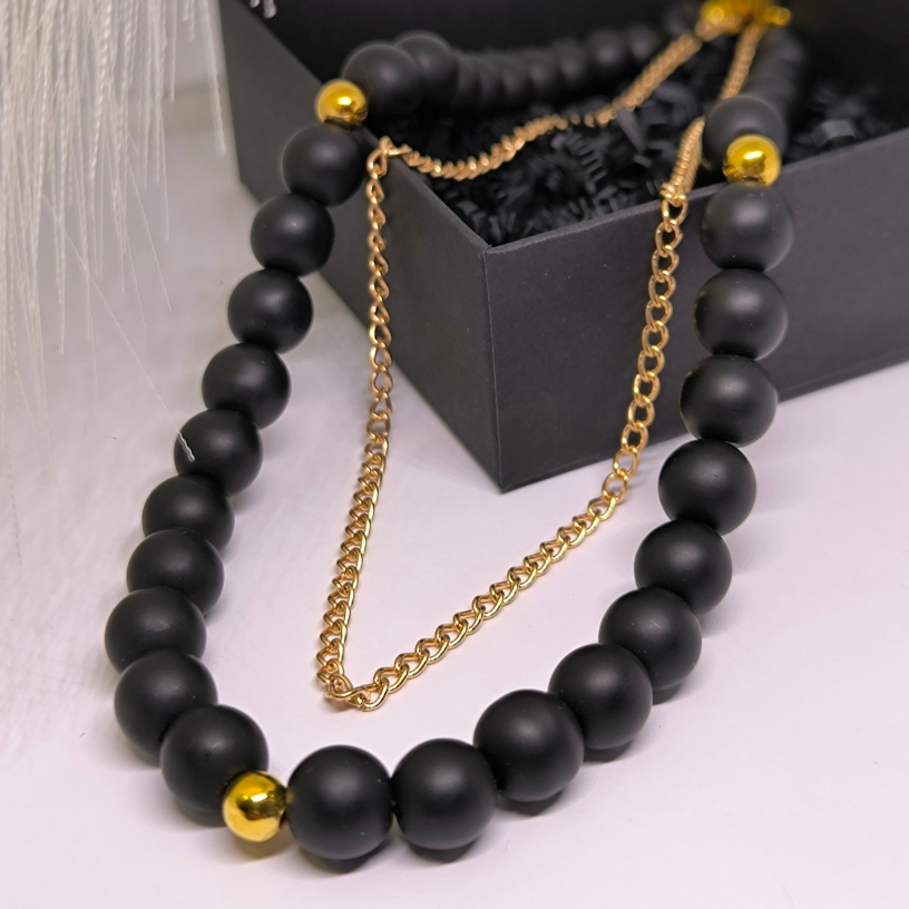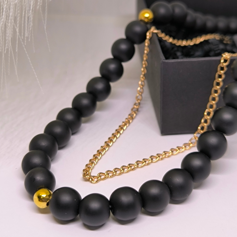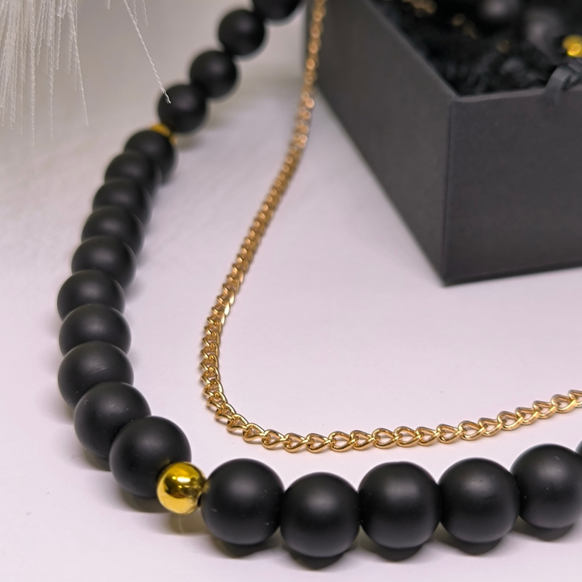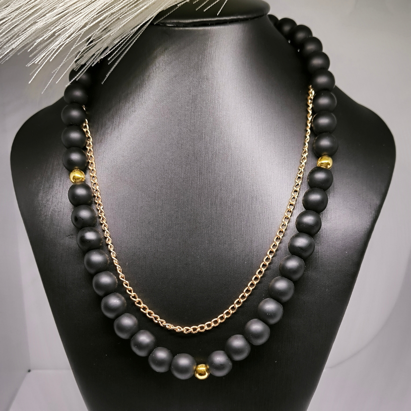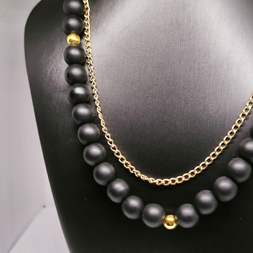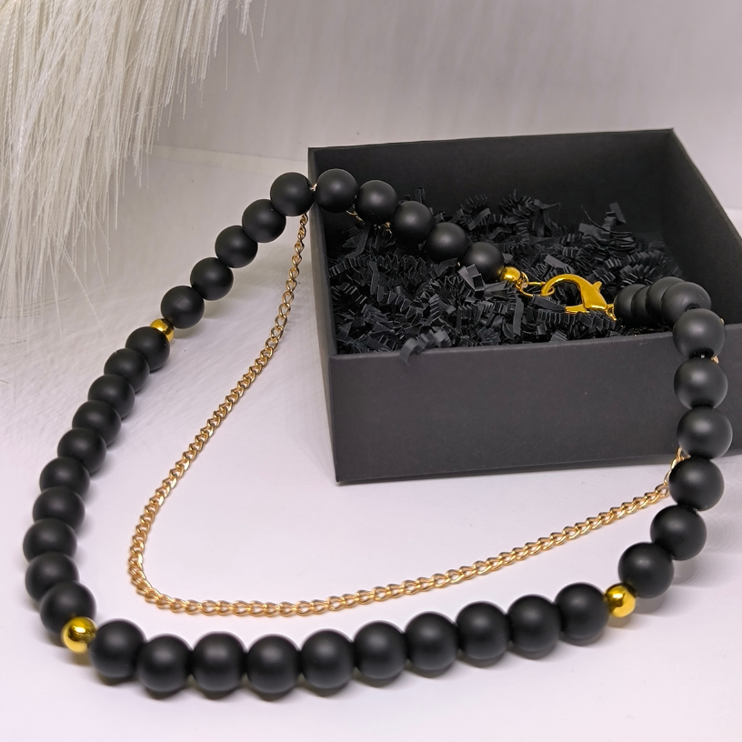 Valmistatud onüksi helmestest, see kaelakee peegeldab salapära ja rafineeritust. Kuldse värvi detailid lisavad peent luksust, mistõttu sobib see kaelakee suurepäraselt nii igapäevaseks kandmiseks kui erilisteks sündmusteks.