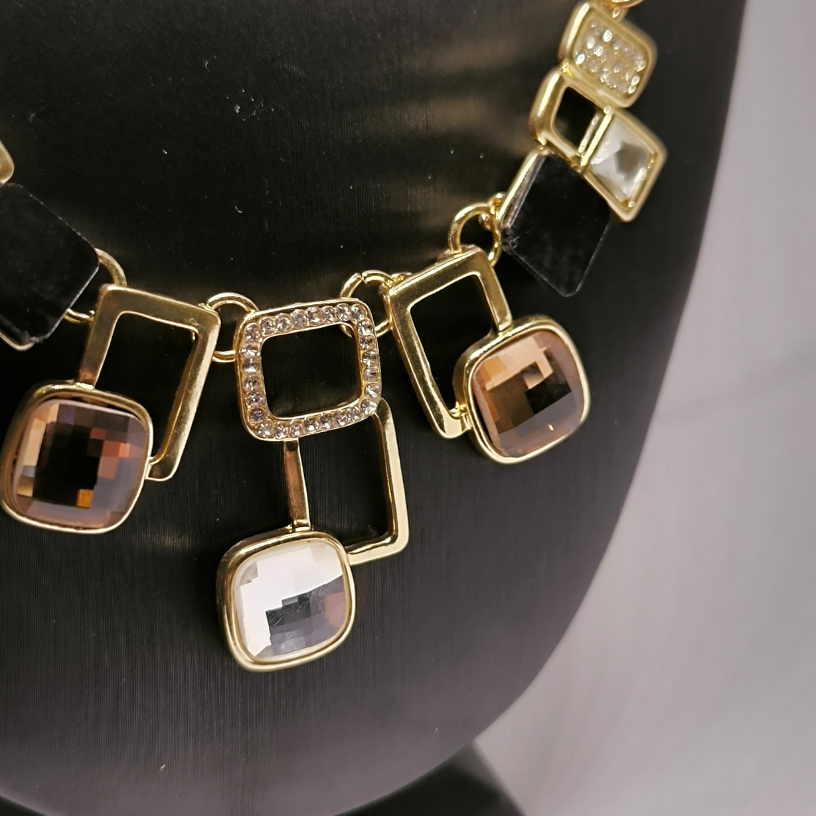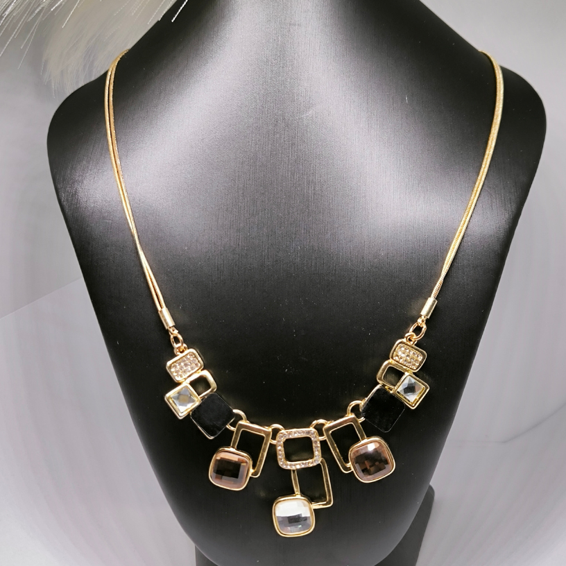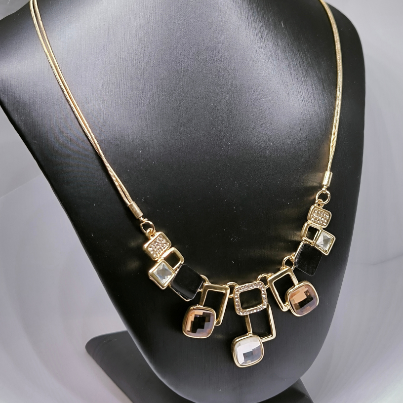 See klassikaline vintage-stiilis kaelakee köidab kindlasti tähelepanu oma säravate Austria kristallide ja väljendusrikka disainiga. Kuldne kett, mille pikkus on 45 cm koos 6 cm pikendusega, on kaunistatud massiivsete geomeetriliste motiividega, mis on kaunistatud kristallide ning musta ja kuldse värvi ruutudega. ✨