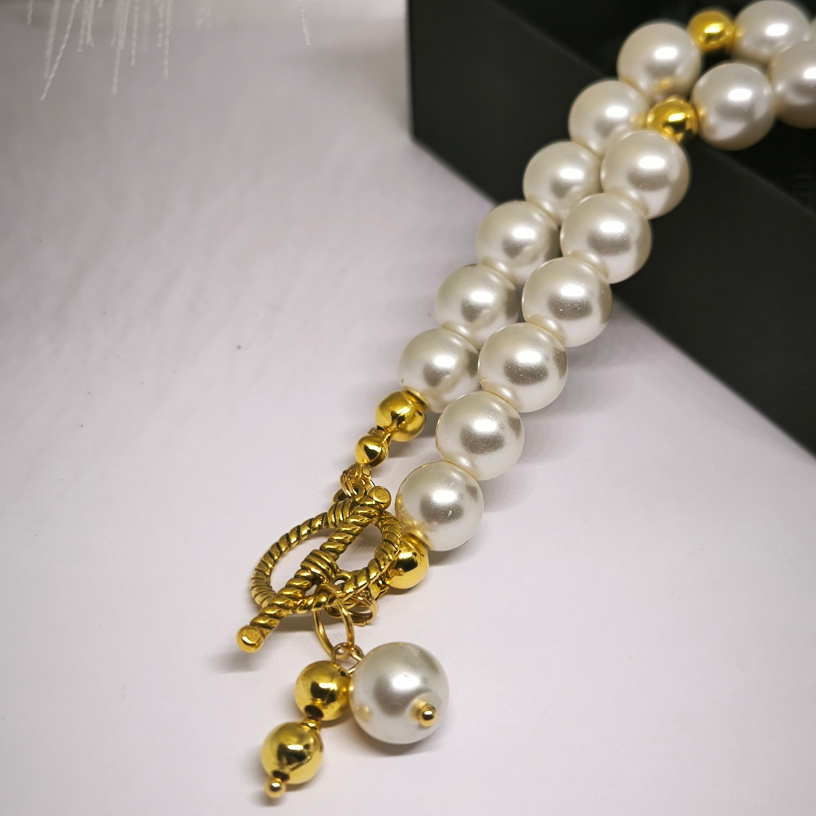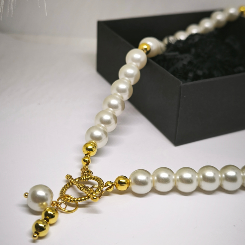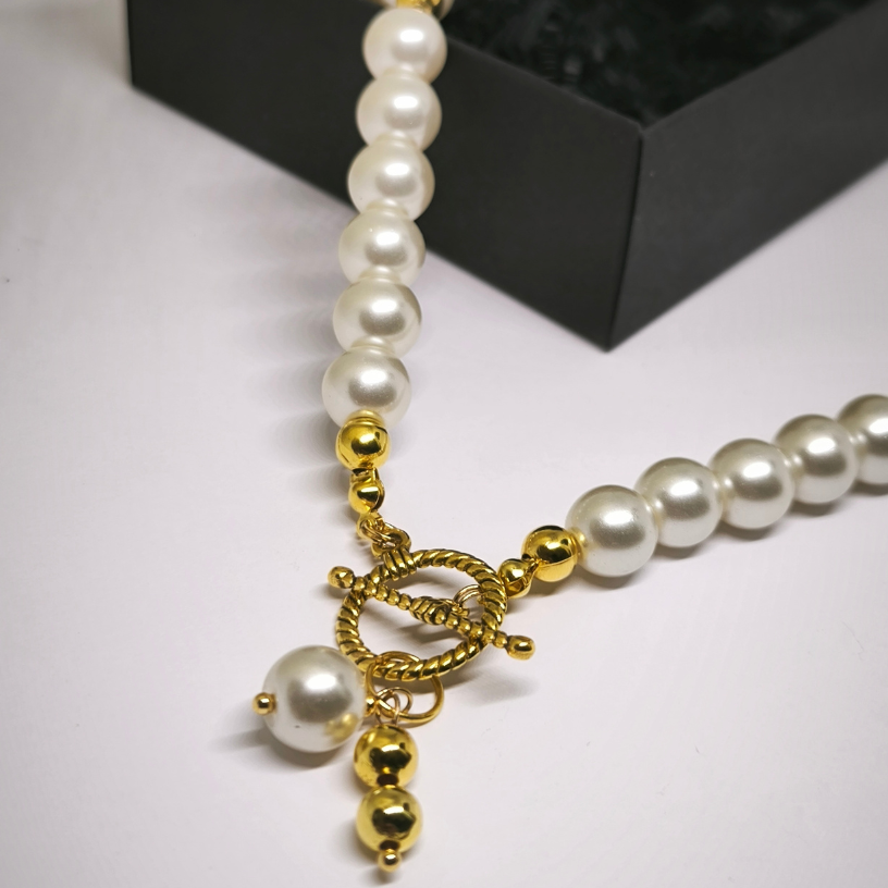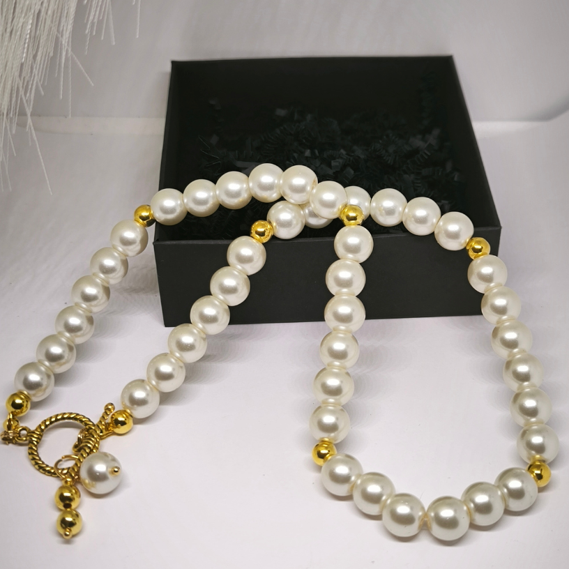 Kas otsite ehet, mis kiirgab luksust ja ajatuid elegantsi? See käsitööna valminud kaelakee klaashelmeste ja kuldsete detailidega – see on täiusliku stiili ja rafineerituse kombinatsioon. 🤍✨