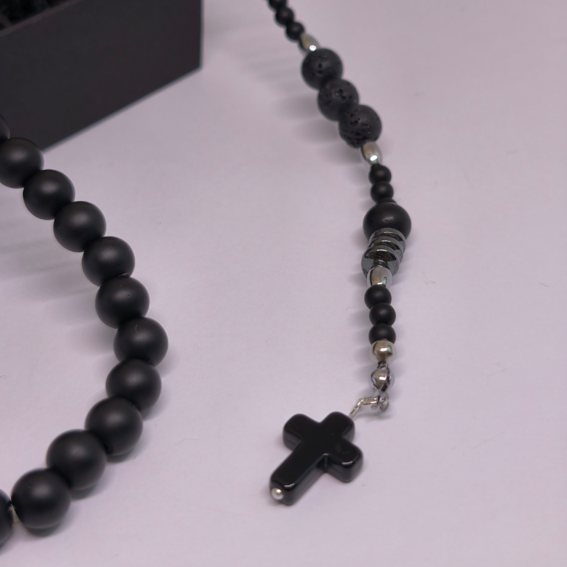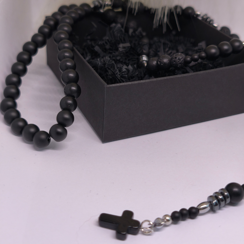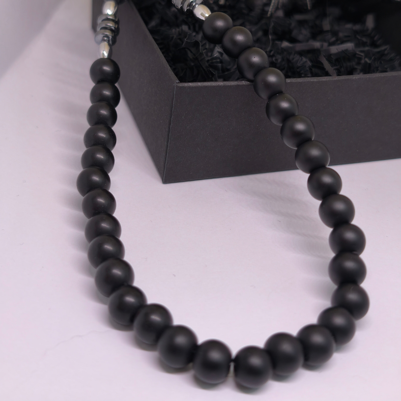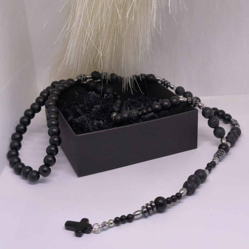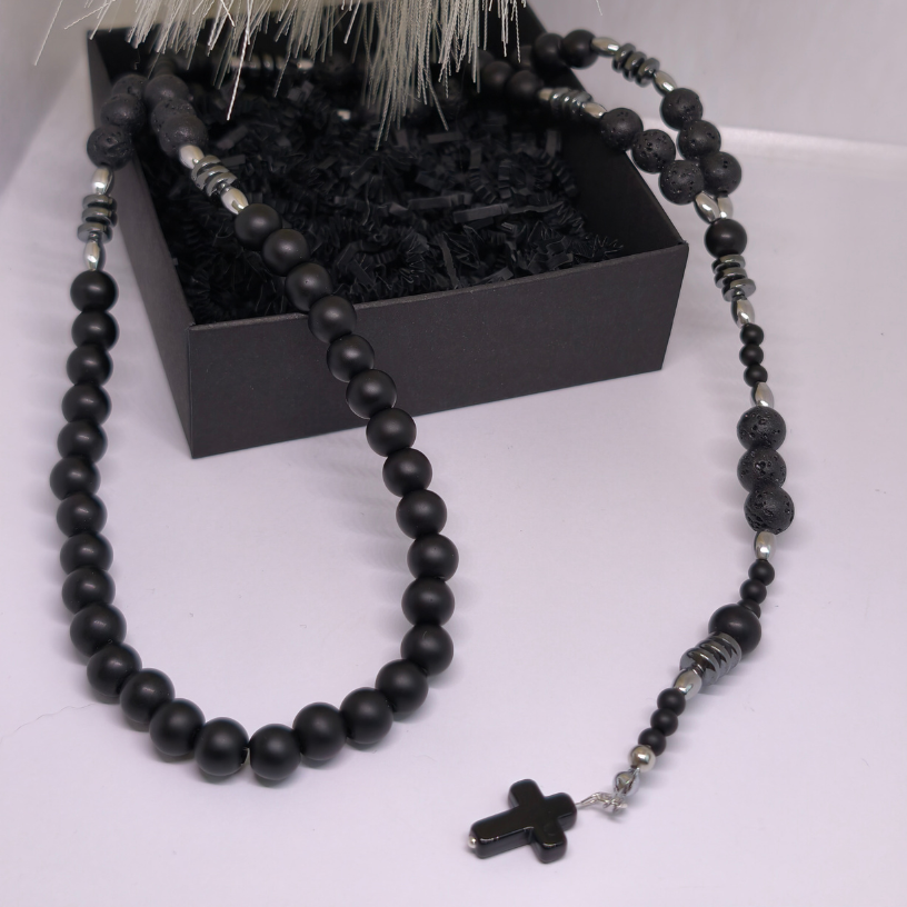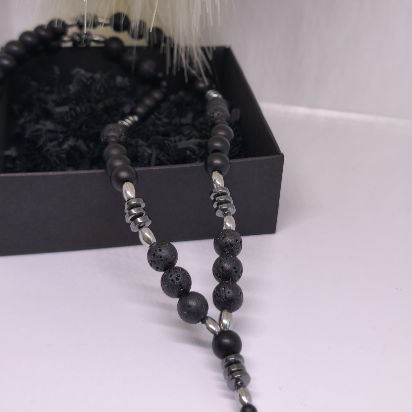 Käekett „Mustade kivide kaitse“ – meeste käsitsi valmistatud kaelakee, mis koosneb looduslikest laava, šungiidi ja hematiidi helmestest. Eriline aksessuaar neile, kes otsivad jõudu, kaitset ja ainulaadsust.