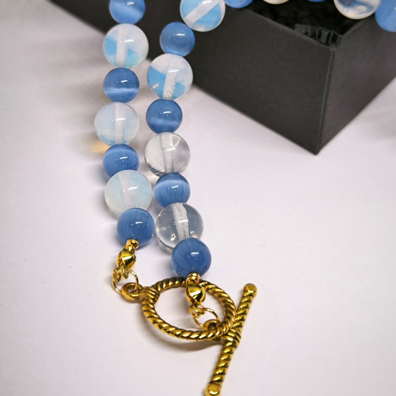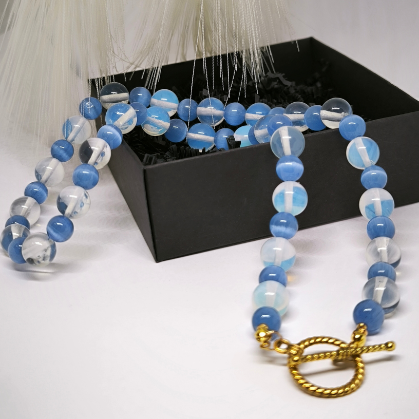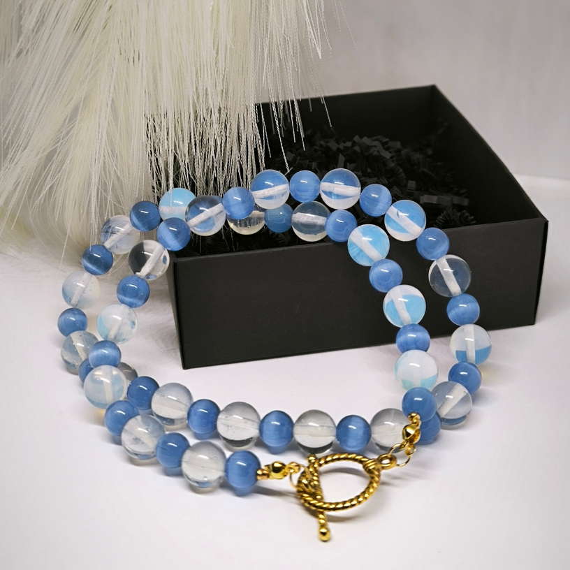 „Sinine Maagia“ on ainulaadne käsitsi valmistatud kaelakee, mis eristub oma peene sinise kassi silma ja opaliidi helmeste kombinatsiooniga. Kaelakee kuldsed detailid lisavad erakordset luksust ja rafineeritust, mistõttu sobib see teos suurepäraselt nii igapäevaseks stiiliks kui ka erilisteks puhkudeks. „Sinise Maagia“ kaelakeega muutub teie välimus kordumatuks ja meeldejäävaks! 💫💎