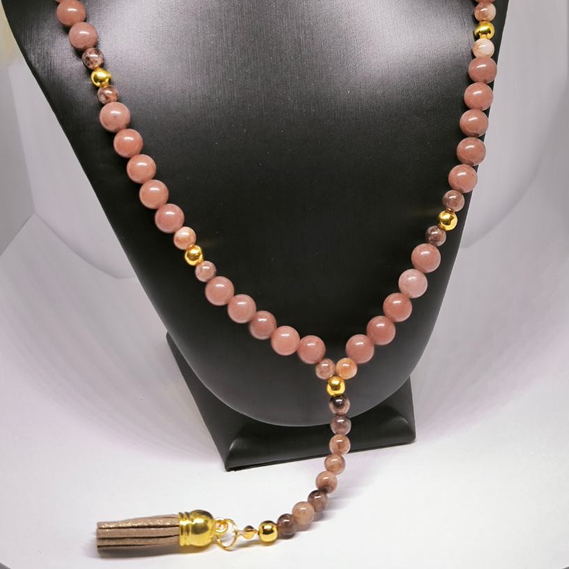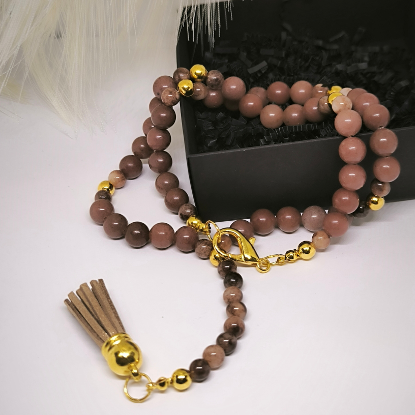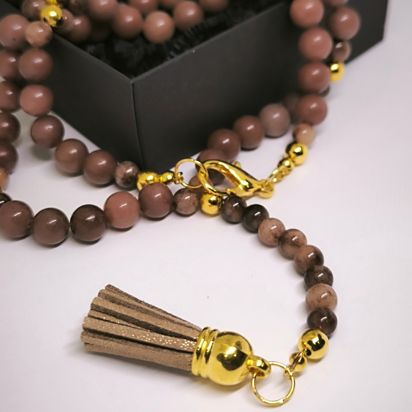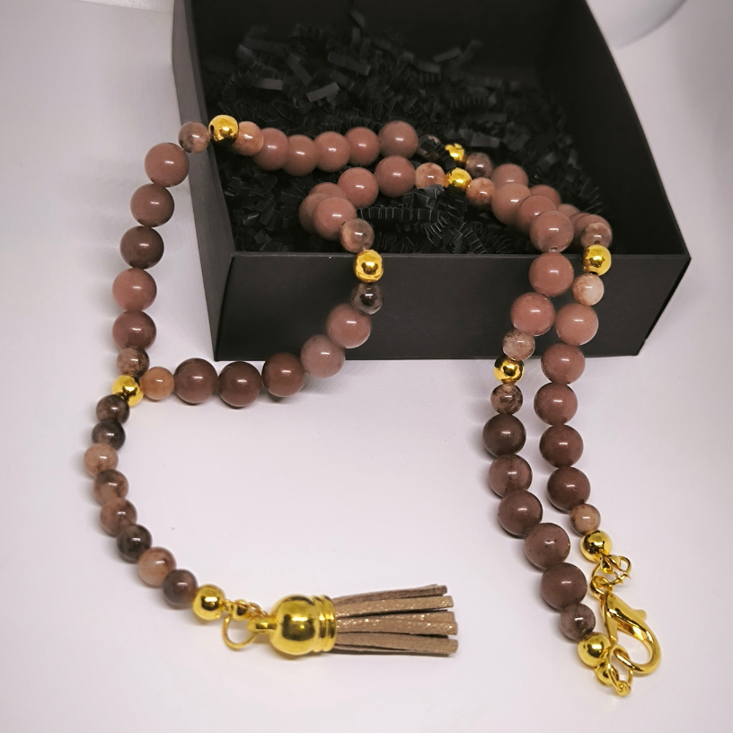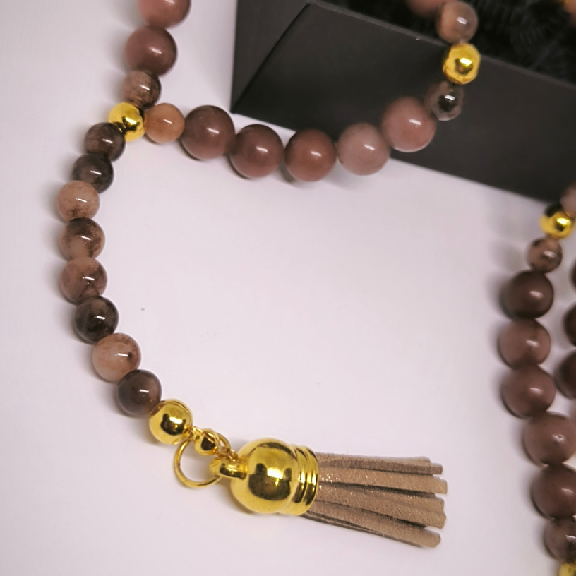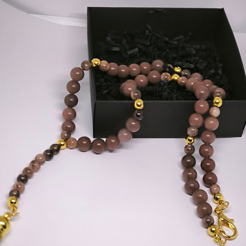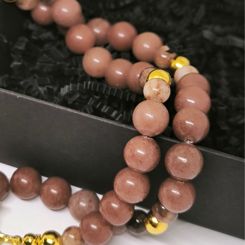 Valmistatud kõrgeima kvaliteediga pruuni aventuriini ja ahhaadi helmestest, see ei näe mitte ainult stiilne välja, vaid omab ka positiivseid energilisi omadusi. Kuldsed detailid lisavad lisavõlu ja luksust, seega sobib see kaelakee suurepäraselt nii igapäevaseks kandmiseks kui ka erilisteks puhkudeks.