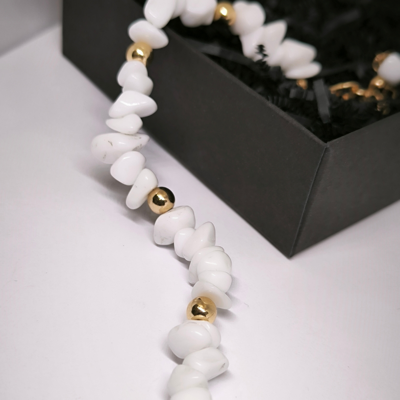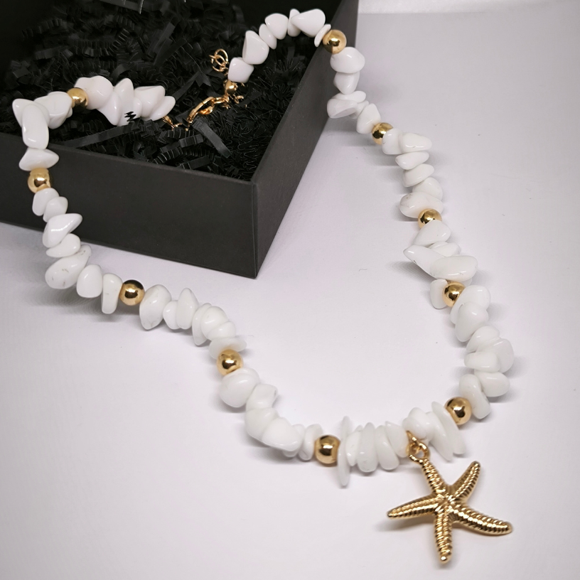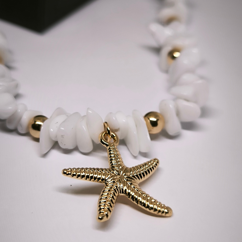 Kaelake „Mere hingus“ on eriline aksessuaar naistele, kes otsivad peenetundelisust, suvist värskust ja loomulikku elegantsi 🌿. Kaelake on valmistatud valgetest kivipärlitest, kaunistatud kuldsete detailidega ning lummava meritähekujulise ripatsiga 🐚 – see meenutab puhkuse mälestusi, merd ja sooja tuult.