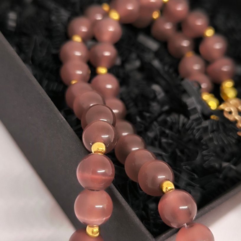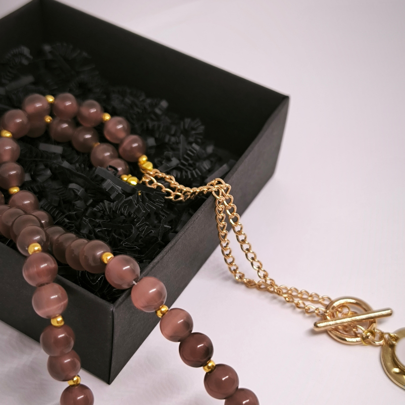 See elegantne käsitsi valmistatud kaelakee ühendab endas luksuse, looduslikkuse ja individuaalsuse. Valmistatud looduslikest tiigri silma helmestest 🟤, ehe kiirgab soojust ja maalähedust, samas kui kuldsete detailide 💛 lisamine annab luksusliku tunde.