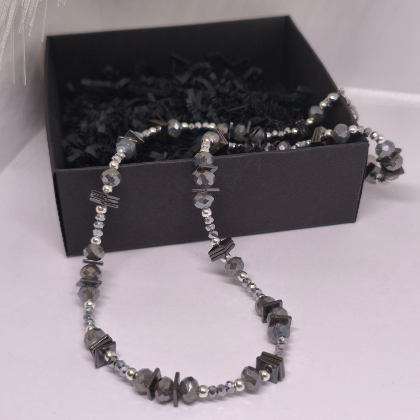 ✨ Käsitööna valminud kaelakee „Grafiidi sära“ – kaasaegse elegantsi ja sisemise tugevuse sümbol.