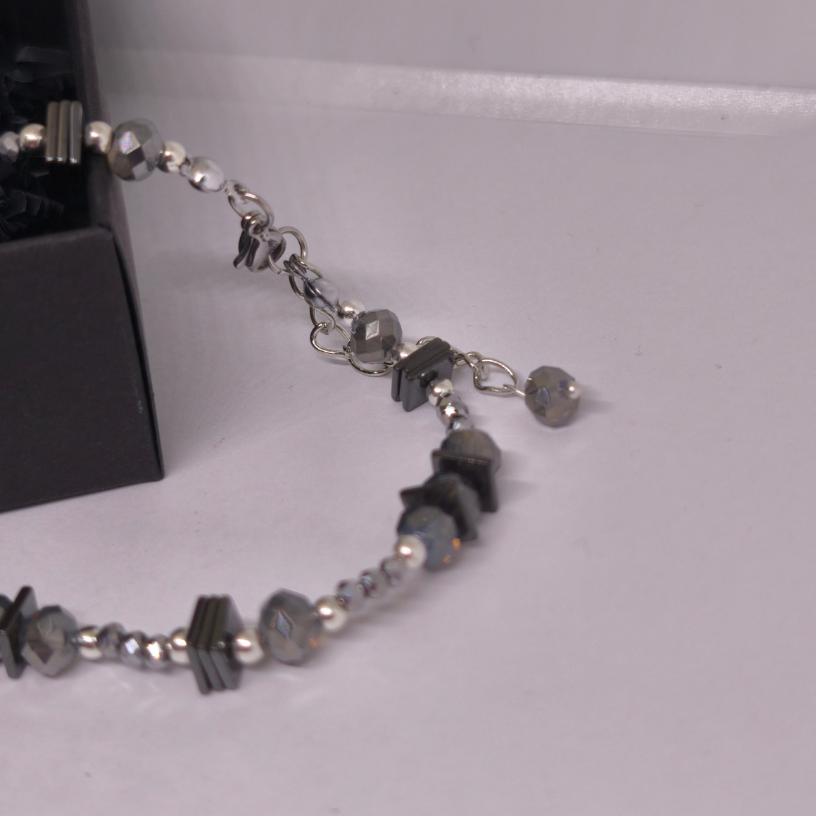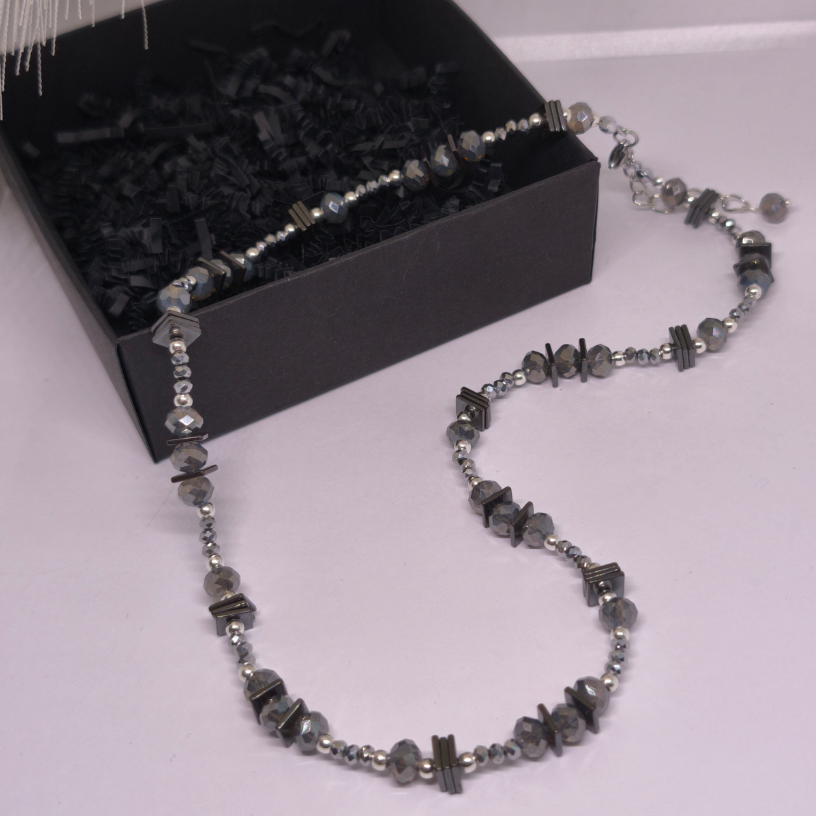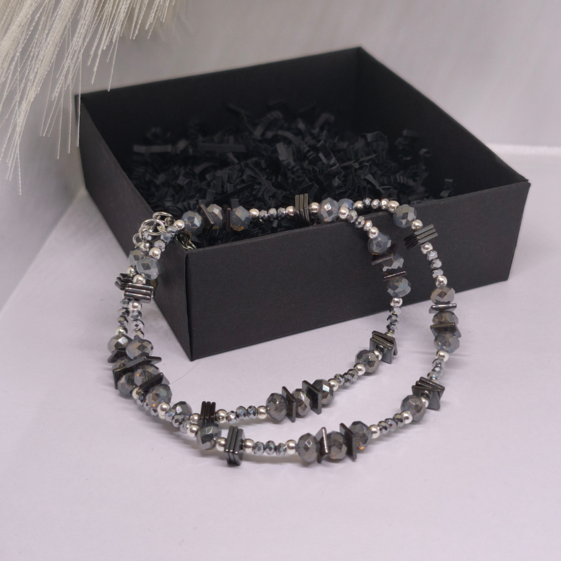 Ehe on valmistatud säravatest klaaskristallidest, hematiidi plaatidest ja hõbedaste detailidega, mis koos loovad rafineeritud, grafiiditooni kompositsiooni. Valgus peegeldub õrnalt kristallides, samas kui hematiit annab ehetele sügavust, tasakaalu ja iseloomu.