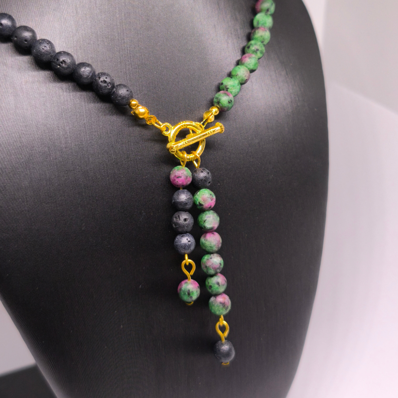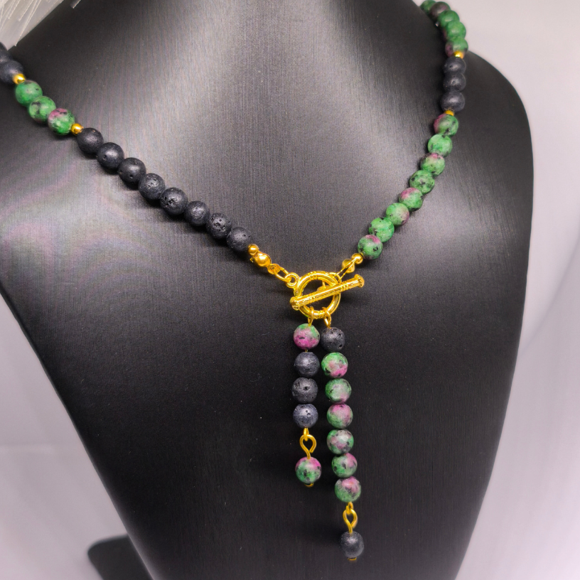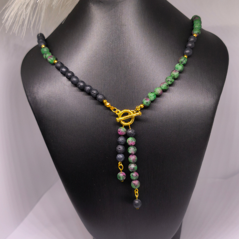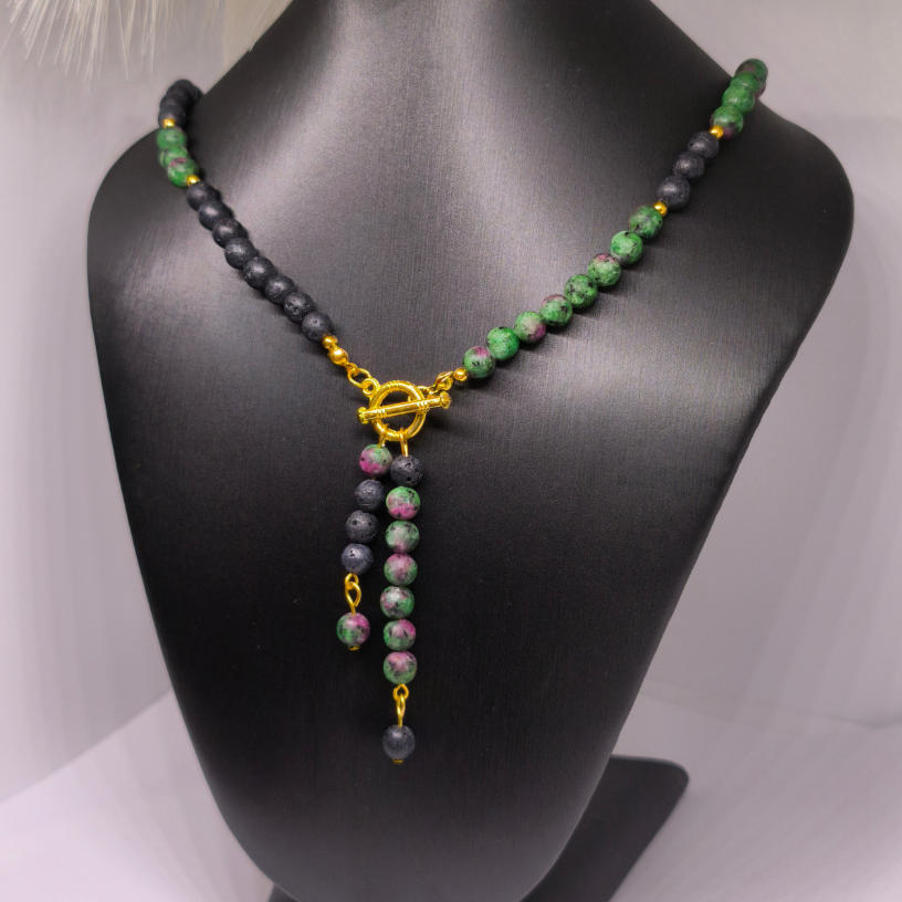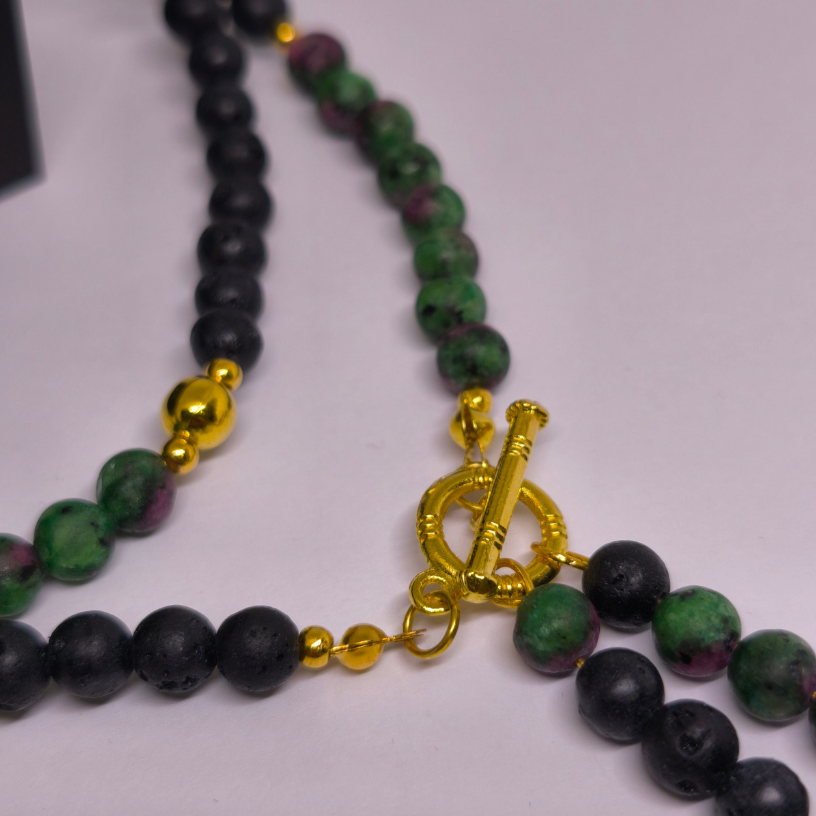 Avasta looduslike kivide erakordne jõud koos käsitsi valmistatud kaelakeega „Lava ja rubiini maagia“. See särava iseloomuga ehe on loodud ühendades mustade laavakivide maalähedust, zoisiidi ja rubiini energiat ning kuldsete detailide luksust. See kaelakee on mõeldud naisele, kes hindab loomulikkust, võimsat sümboolikat ja ainulaadset disaini. 🔥💚💛