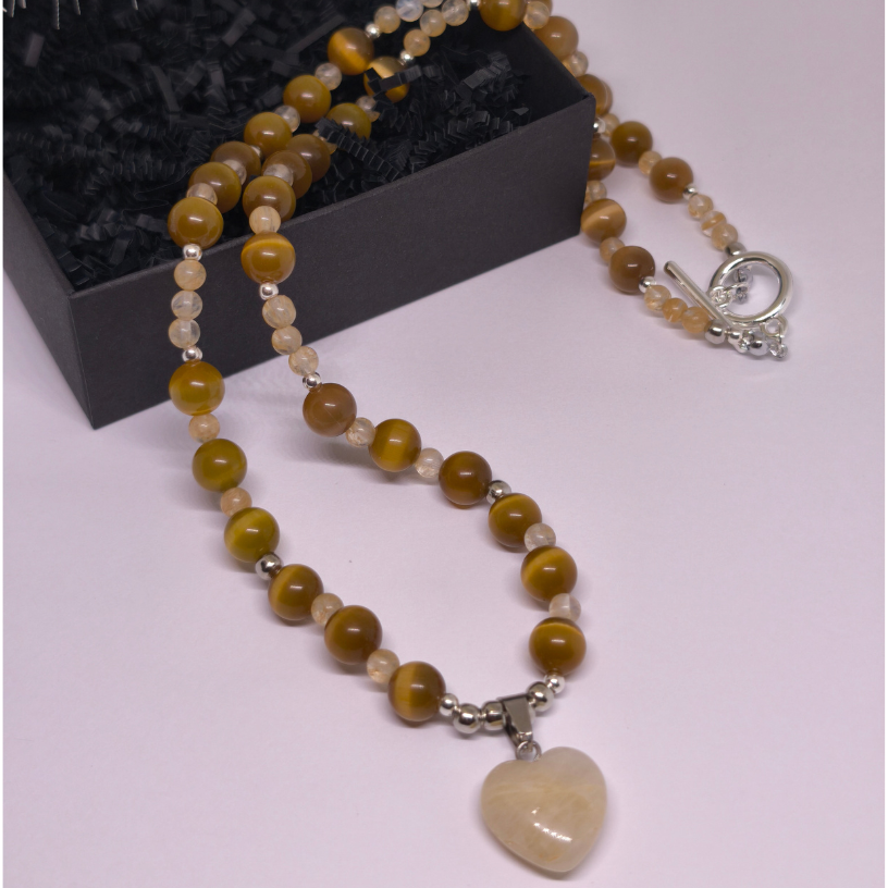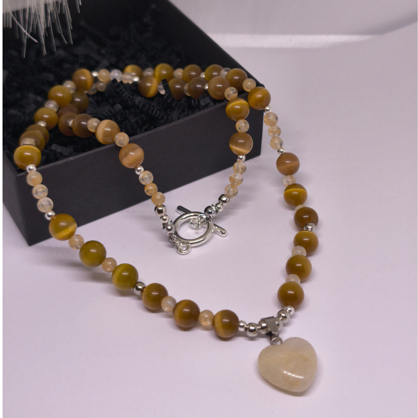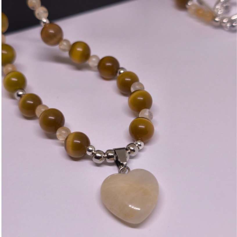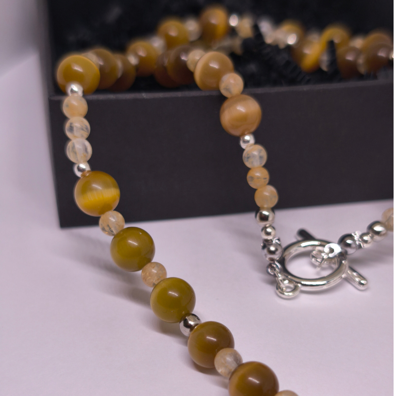 Laske valgusel koos teiega särada – see ainulaadne käsitööna valminud kaelakee „Päikesesära“ on loodud looduslikest kassi silma ja rutiilkvartsi helmestest, mille soe toon meenutab päikesevalgust ja sisemist rahu 🌼.
