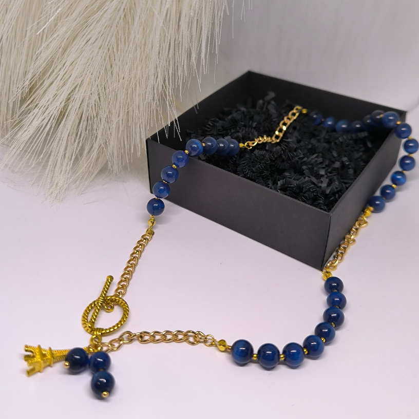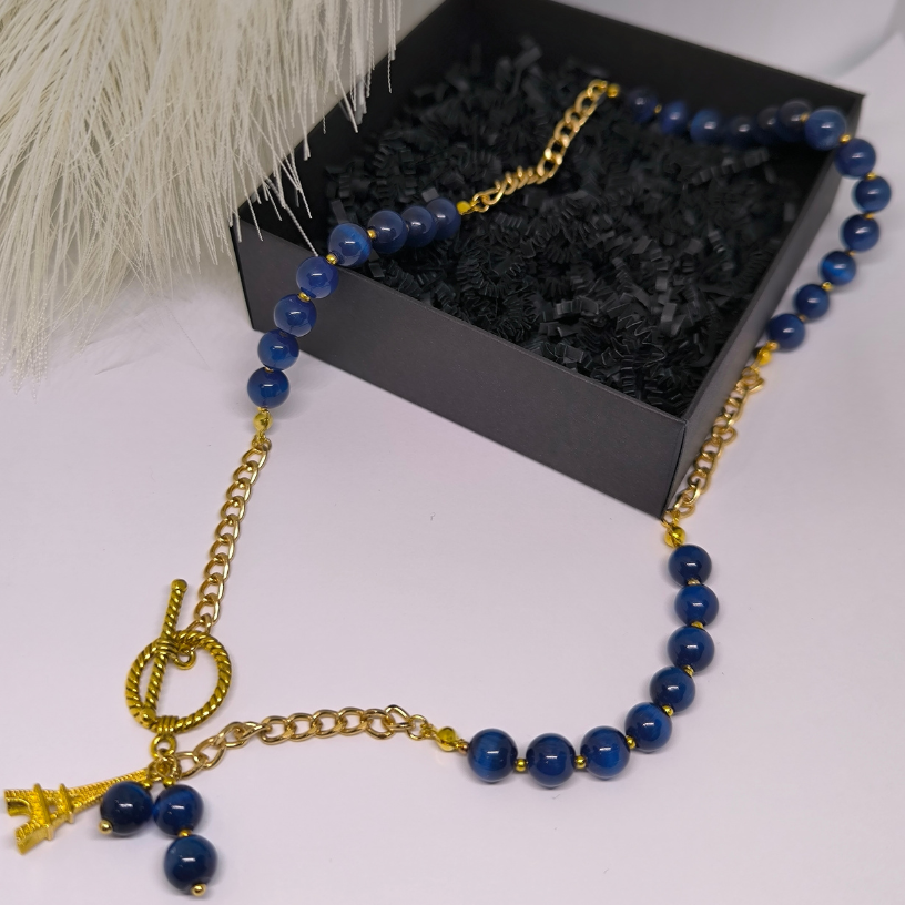 See ainulaadne käsitööna valminud kaelakee on inspireeritud öise Pariisi kütkest, mida väljendavad luksuslikud sinise kassi silma helmed. 💎 Need 8 mm suurused helmed paistavad silma peene valguse peegeldusega, luues müstilise ja luksusliku efekti. Kuldne detail lisab ehtesse veelgi rafineeritust, samas kui Eiffeli torni ripats sümboliseerib armastust, romantikat ja ainulaadset stiili. 🌟