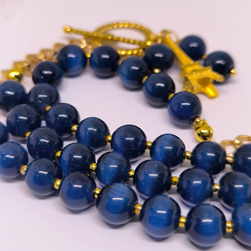 ✔ Luksuslik disain – sinise kassi silma helmed ja kuldsed detailid.