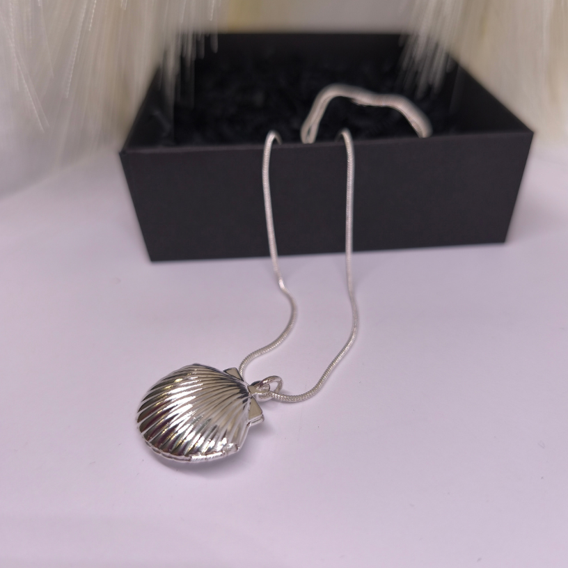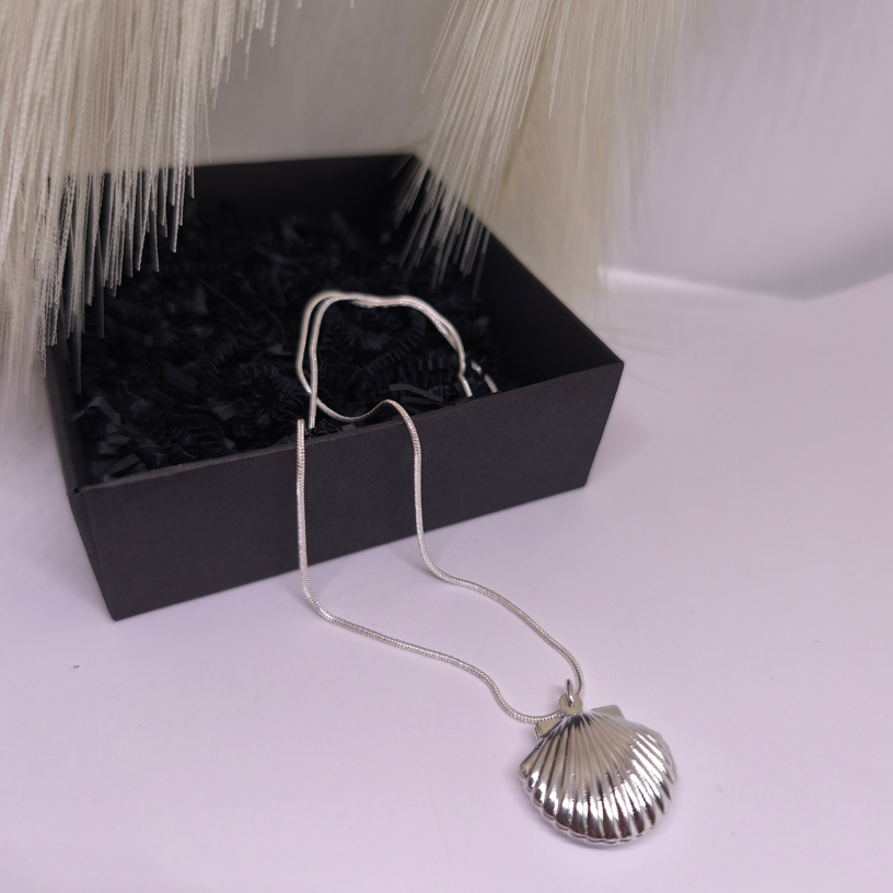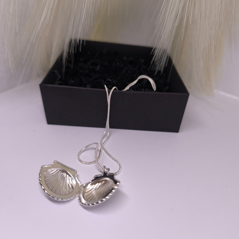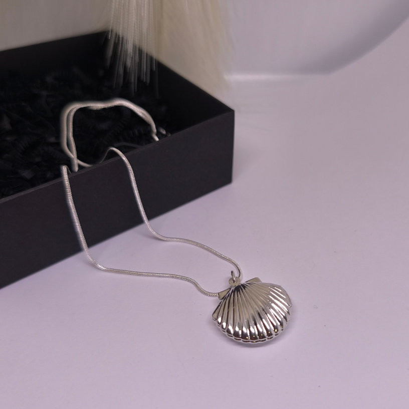 Medaljon „Mere saladus“ – elegantne, hõbedane ehe, mis on inspireeritud mere lainete ja karpide ilust. Täiuslik aksessuaar, mis peidab südame saladust.