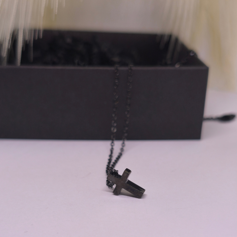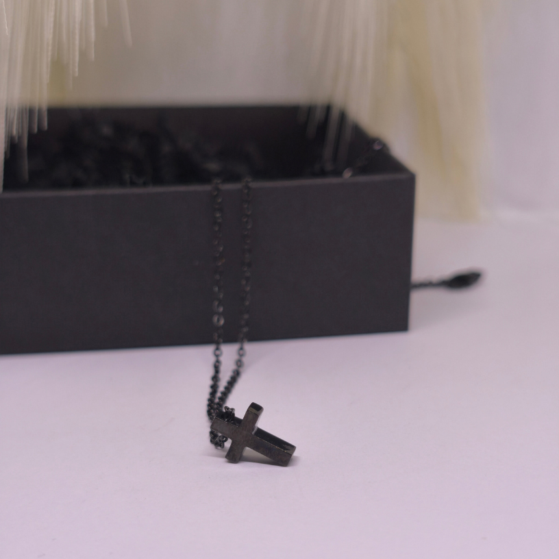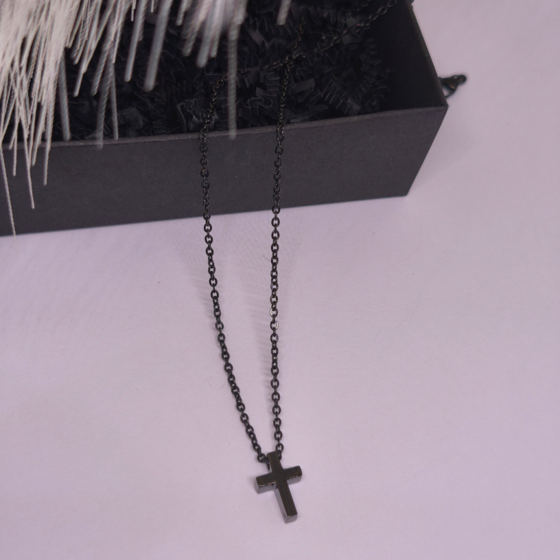 See minimalistliku disainiga kee köidab pilku oma mustast läikest ja peenest ristikuju ripatsist ✝️, mis sobib suurepäraselt nii igapäevase riietuse kui ka õhtuse välimuse juurde.