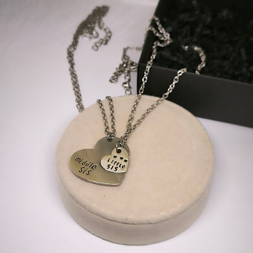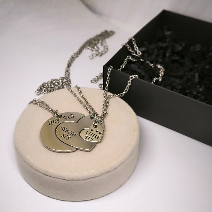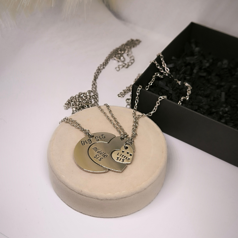 See imeline hõbedavärvi kaelakeede komplekt „Big sis“, „Middle sis“ ja „Little sis“ on suurepärane kingitus, mis sümboliseerib tugevat õdede sidet. Komplekti kuuluvad kolm elegantset kaelakeed ja kolm ripatsit, mis kokku moodustavad südame – see on armastuse ja sõpruse sümbol! 💖
