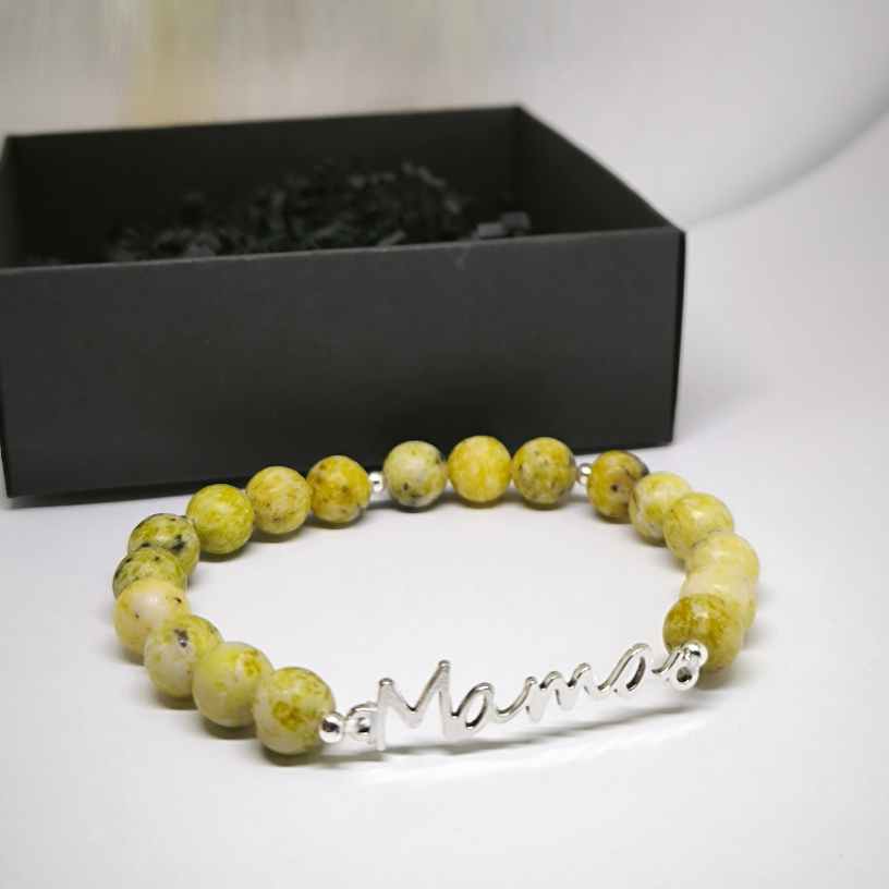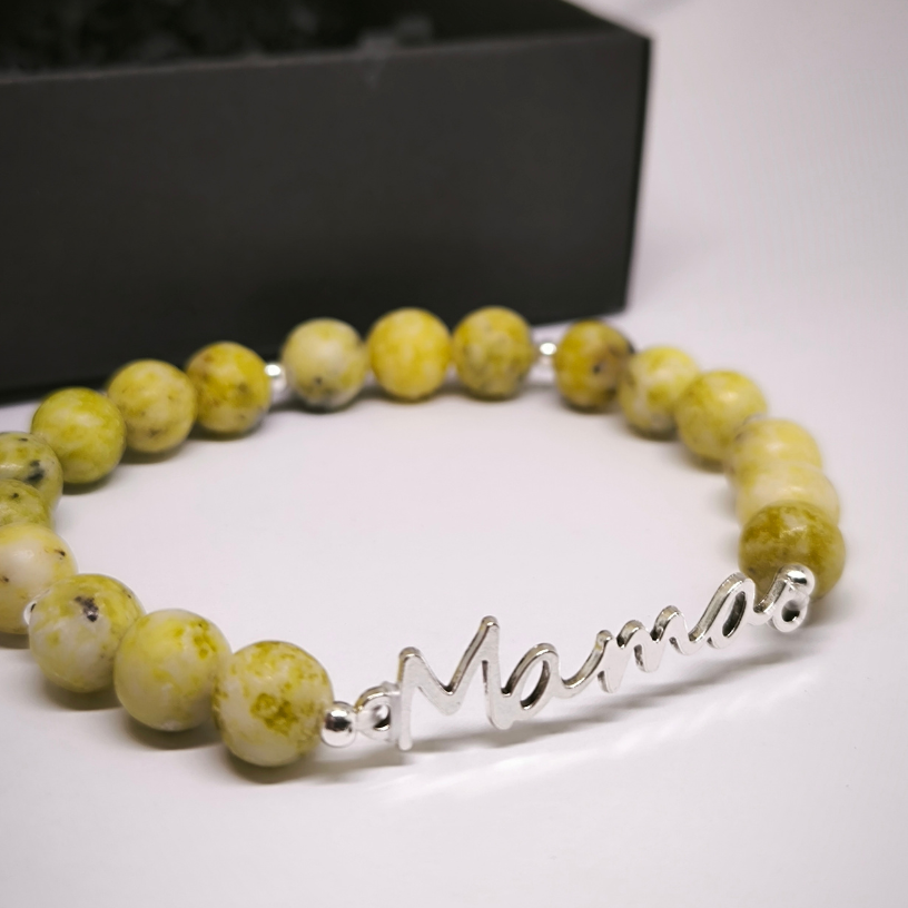 🌟 Käsitööna valminud käevõru “Mama” – see on eriline ehe, mis on ideaalne kingitus emadepäevaks! Valmistatud naturaalsest türkiiskivist helmestest, see käevõru näeb välja mitte ainult elegantne, vaid omab ka harmoniseerivaid omadusi. Hõbedased detailid lisavad sellele käevõrule kaasaegset võlu, samas kui unikaalne kiri “Mama” sümboliseerib armastust ja tänulikkust. 🎁