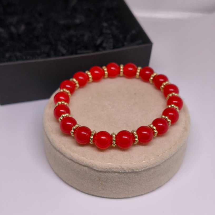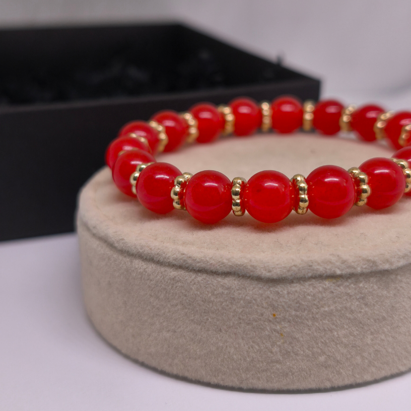 Käsitsi valmistatud käevõru “Punane energia” on valmistatud naturaalsest kaltsedoni kivist ja kaunistatud kuldsete detailidega. Elegantne aksessuaar, mis annab jõudu, enesekindlust ja stiilse aktsendi igaks päevaks.