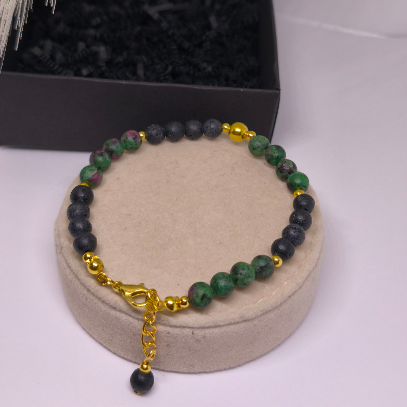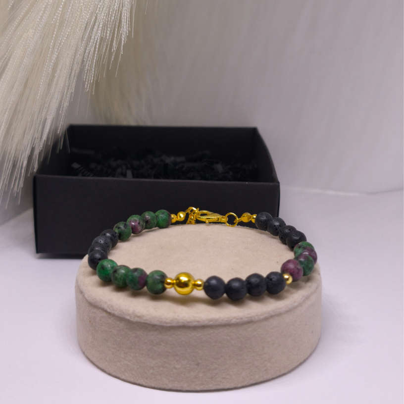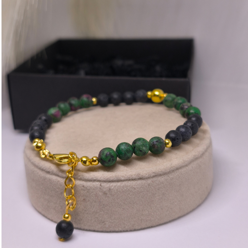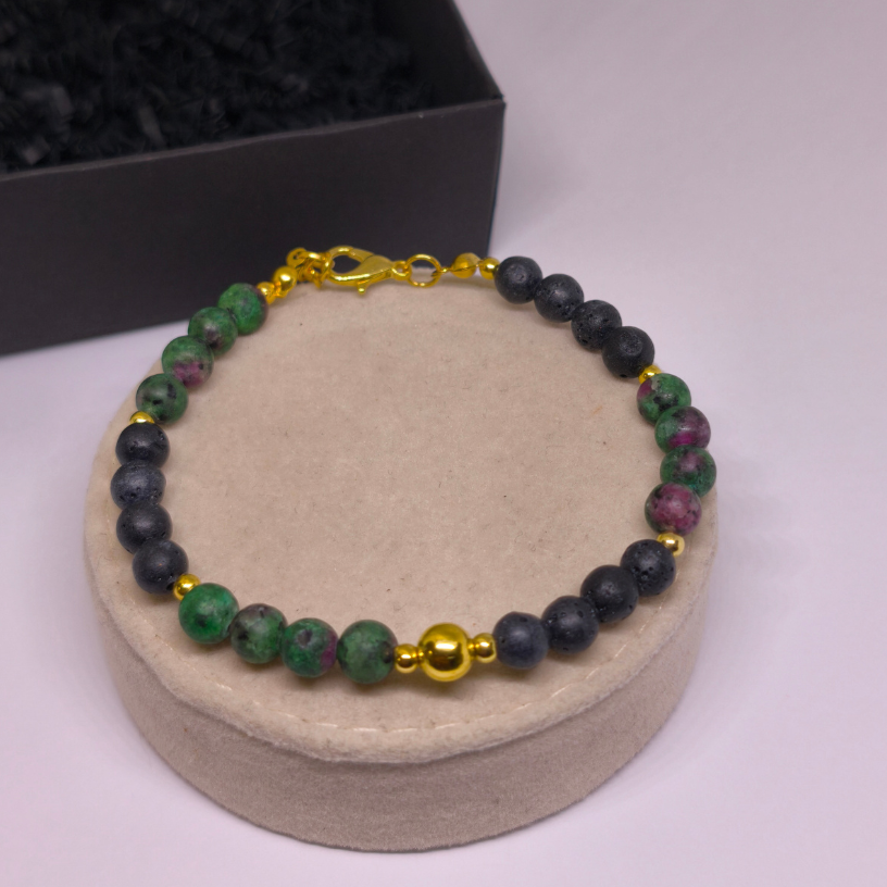 Zoisiit rubiiniga paistab silma roheliste ja roosade toonide mänguga, mis annab käevõrule elu. Laavakivid tasakaalustavad õrnalt värve, luues elegantse kontrasti.