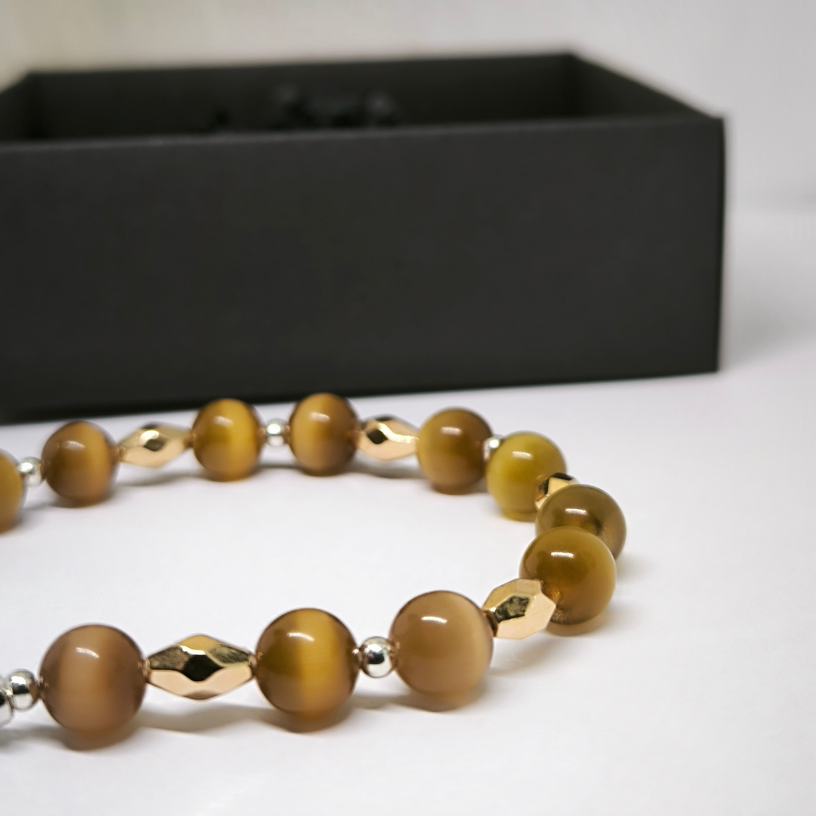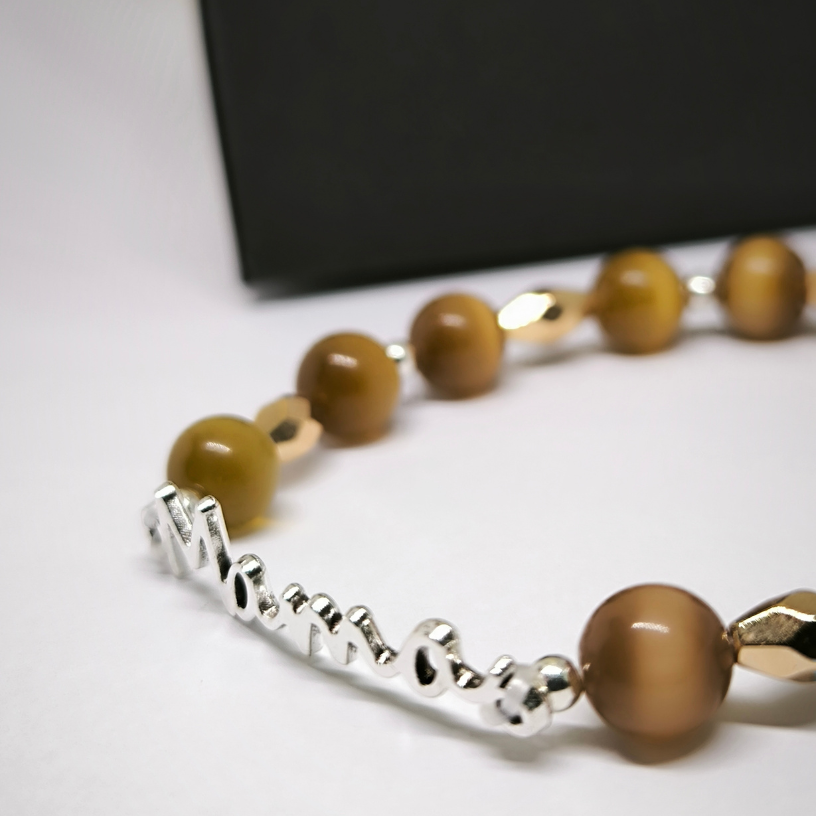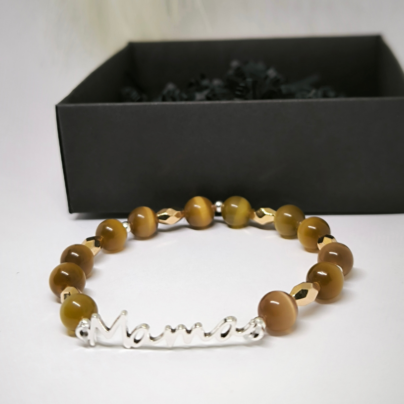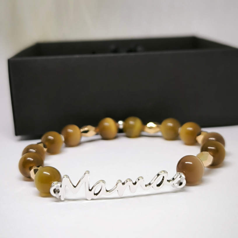 Eksklusiivne käsitöö käevõru naturaalse kassisilma kividega, hõbedase kirjaga „Mama“ ja kulddetailidega. Stiilne ja tähendusrikas kingitus kõige kallimale inimesele – emale.