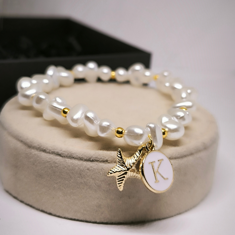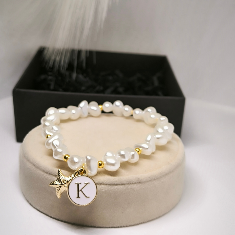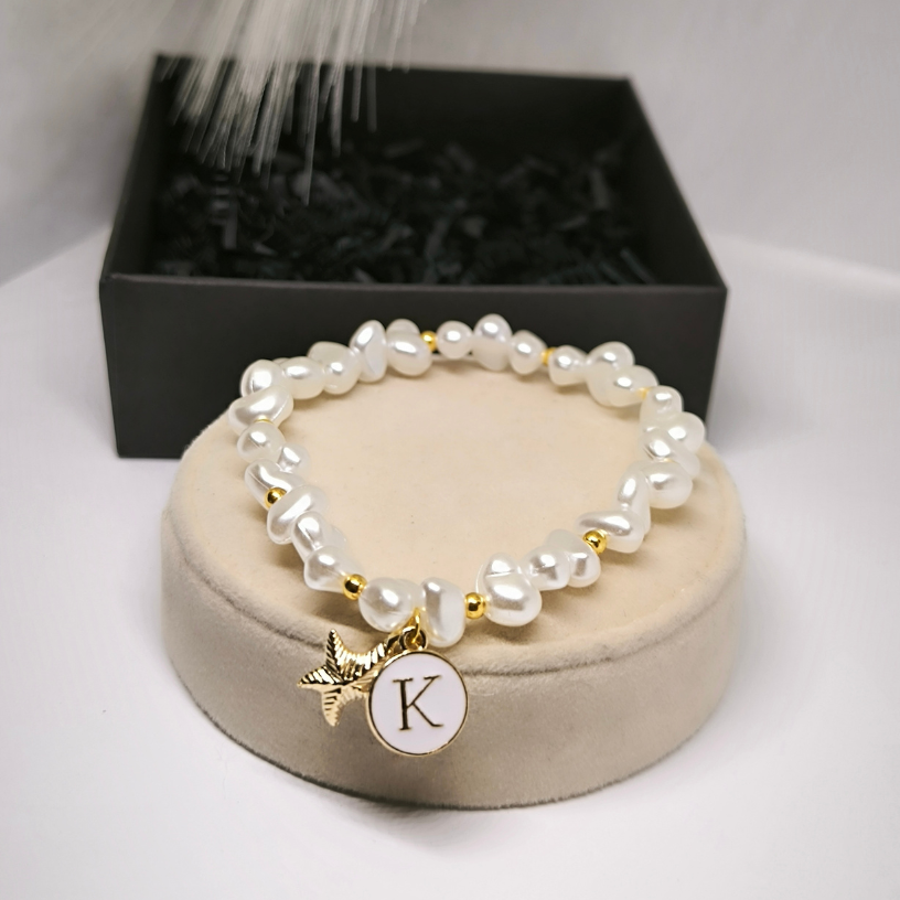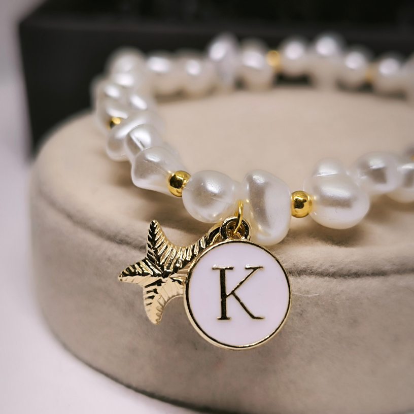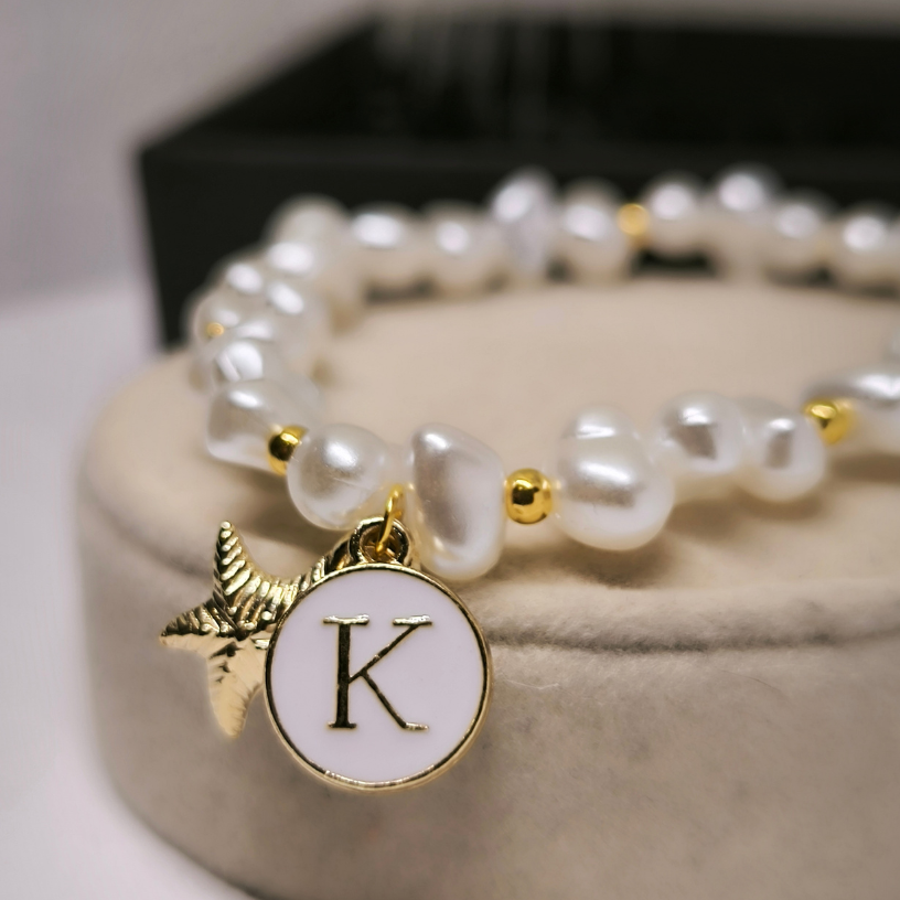 See elegantne käevõru on valmistatud pärliimitatsiooniga helmestest, kaunistatud kuldsete detailidega ja võluva meritähe ripatsiga. Käevõrule lisatakse ka teie valitud initsiaal, muutes selle isiklikuks ja eriliseks kingituseks nii endale kui ka kallile inimesele. 💖
