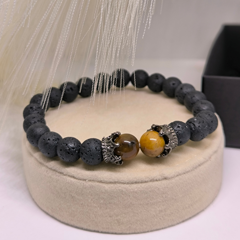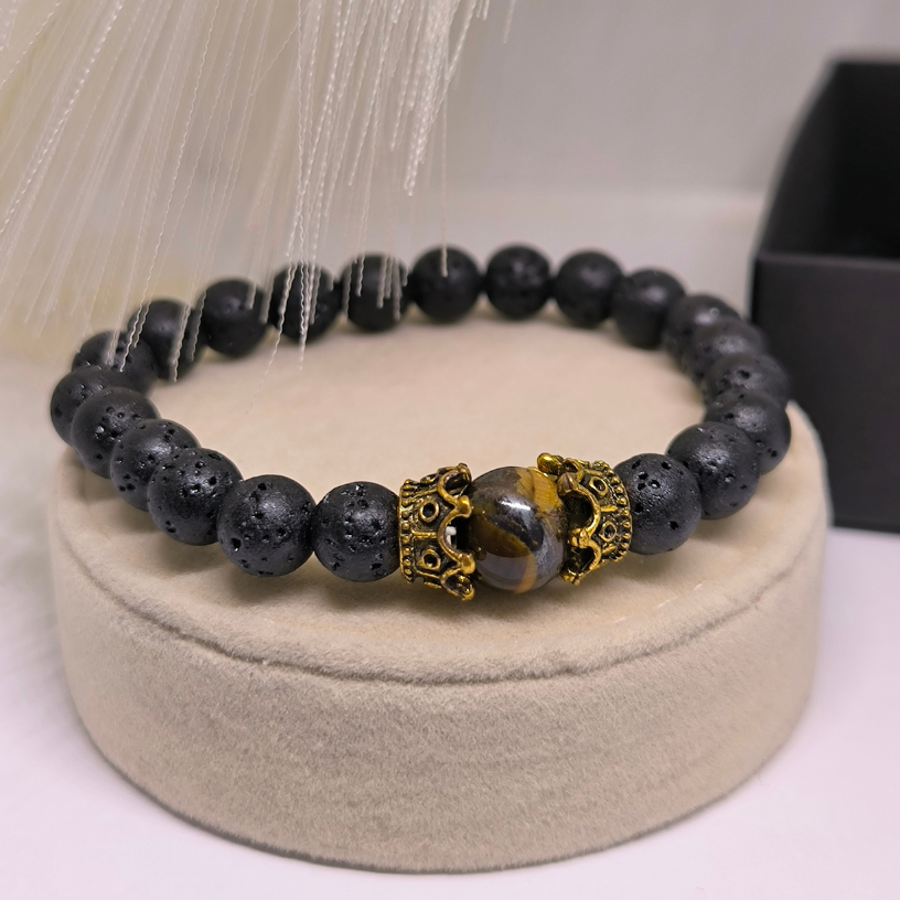 🔹 Looduslikud laavakivi helmed – annavad maa energiat, rahustavad ja aitavad säilitada emotsionaalset tasakaalu.