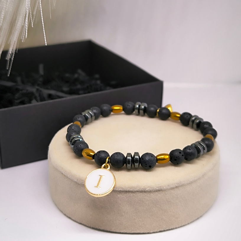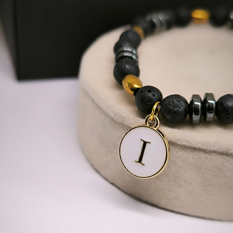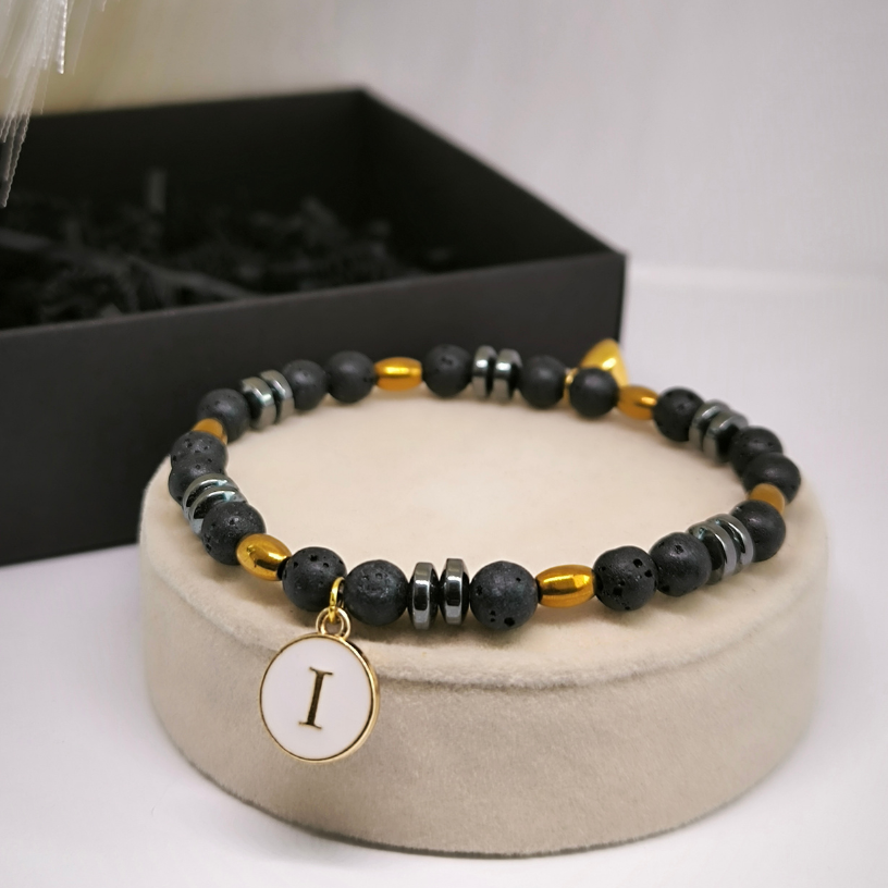 Käsitsi valmistatud käevõru on tehtud kõrgekvaliteedilistest laava- ja hematiidihelmestest, mida kaunistavad kuldset tooni detailid ning isikupärane ripats teie valitud tähega. See on imeline viis jäädvustada teile oluline inimene – kallim, sõber või isegi iseennast.