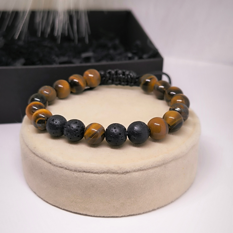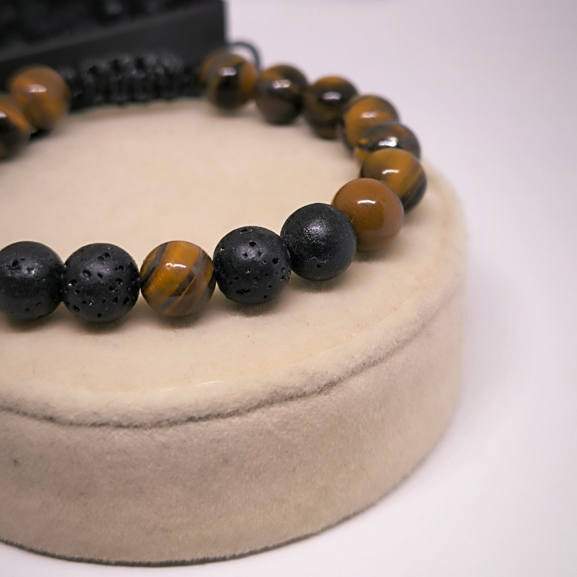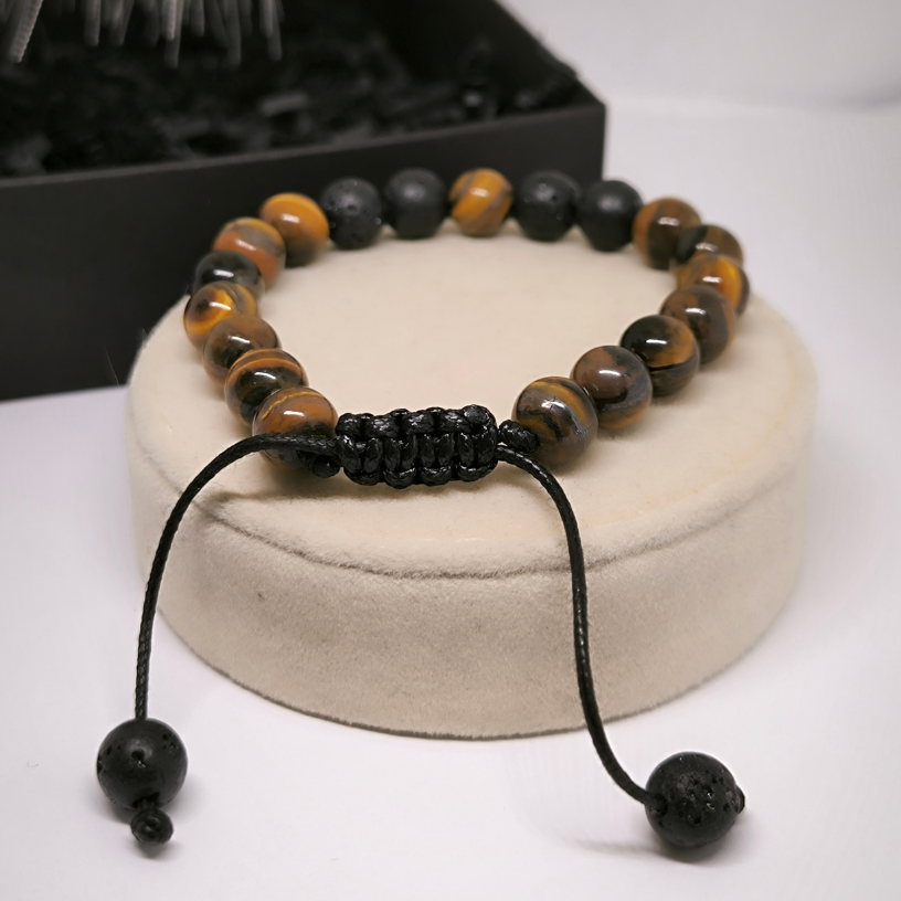 Lava- ja tiigrisilmahelmestest käevõru – võimas talisman, mis aitab emotsioone kontrollida, suurendada motivatsiooni ja meelitada ligi edu. Kohandub kergesti randme ümbermõõdule, mistõttu on see mugav igapäevaseks kandmiseks.