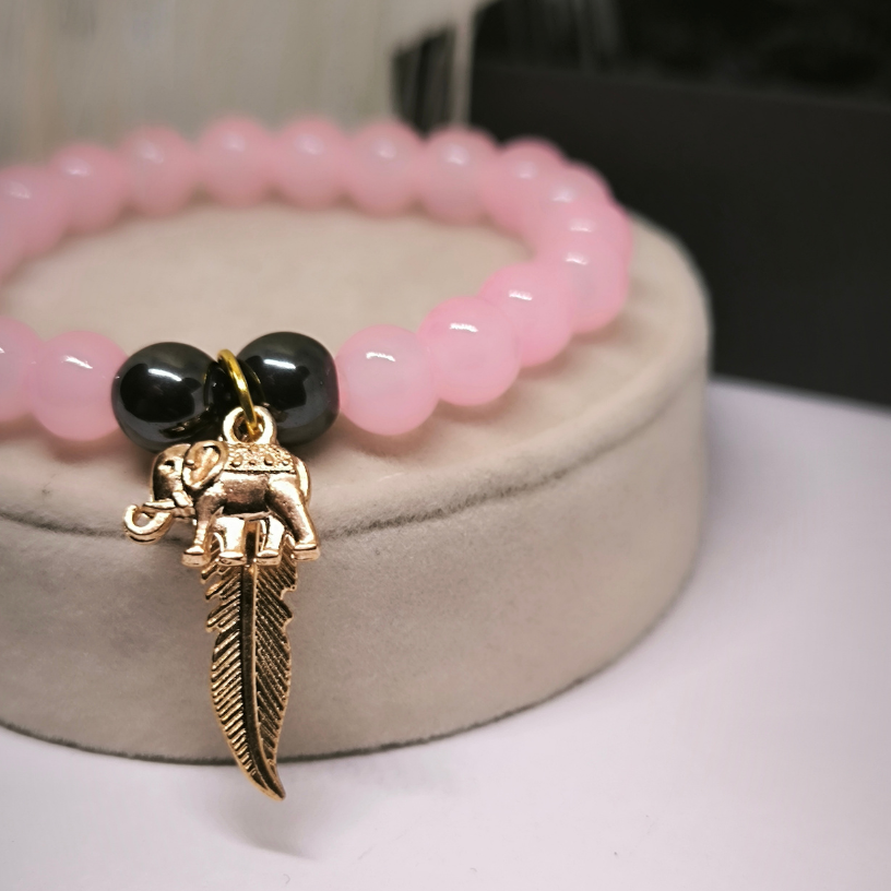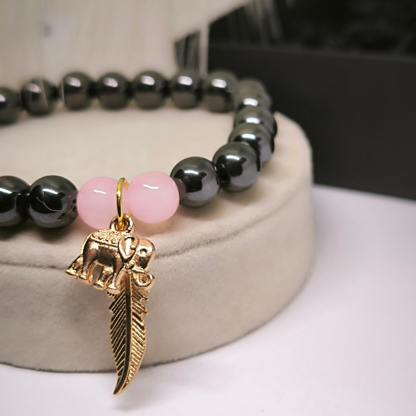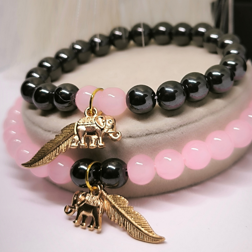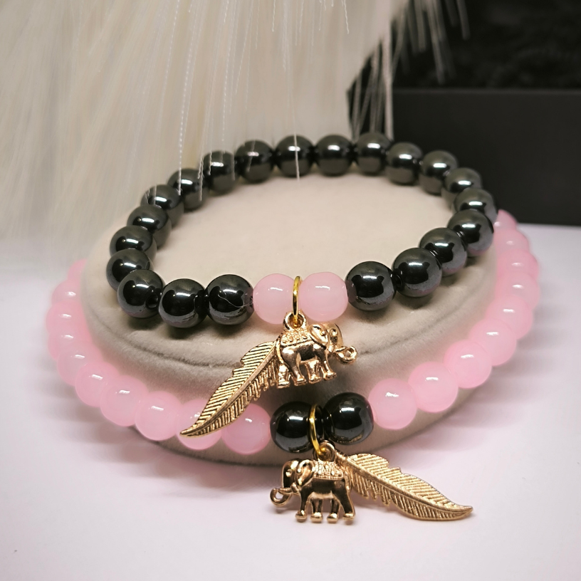 Valmistatud klaasist ja hematiidist helmestest, need käevõrud ei ole mitte ainult esteetilised, vaid kannavad ka erilist energiat. Kuldse värviga detailid annavad ehetele elegantsi ja luksust ning nende sümboolne tähendus sobib ideaalselt armastuse ja tugeva sideme sümboliks.
