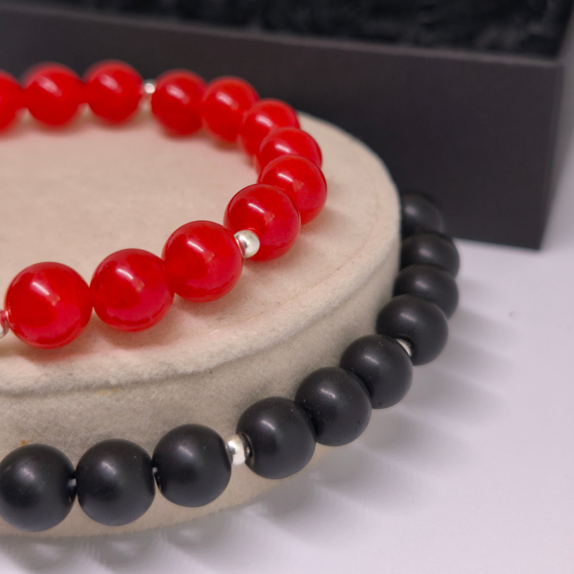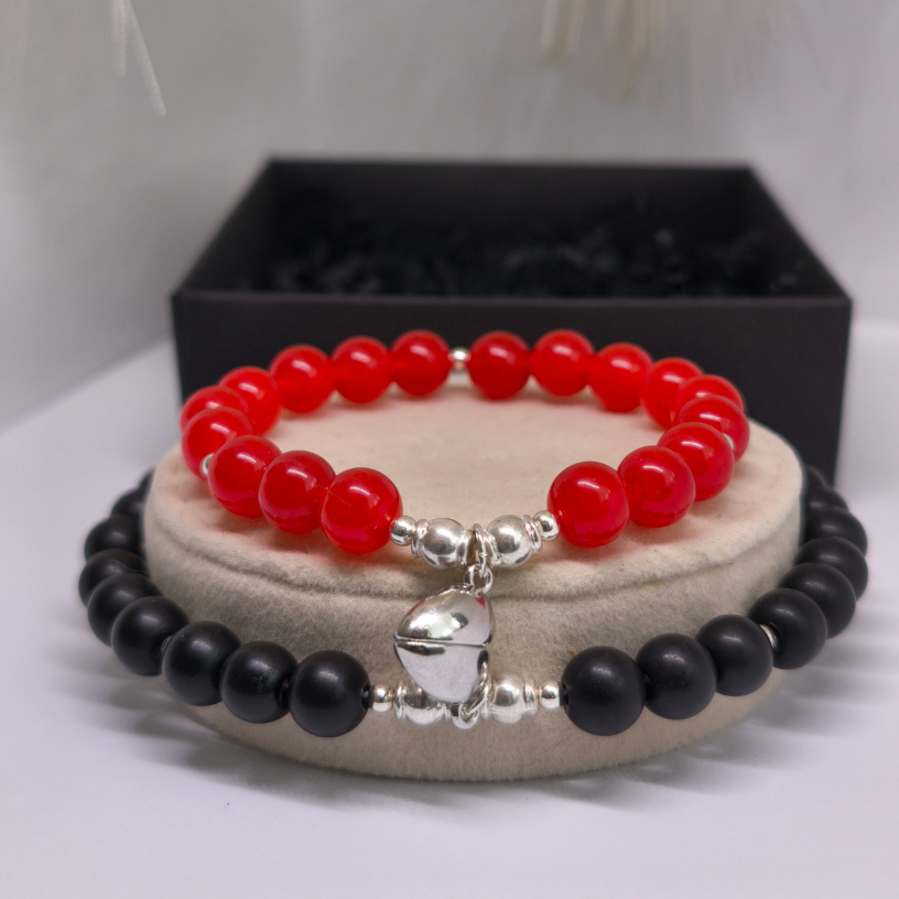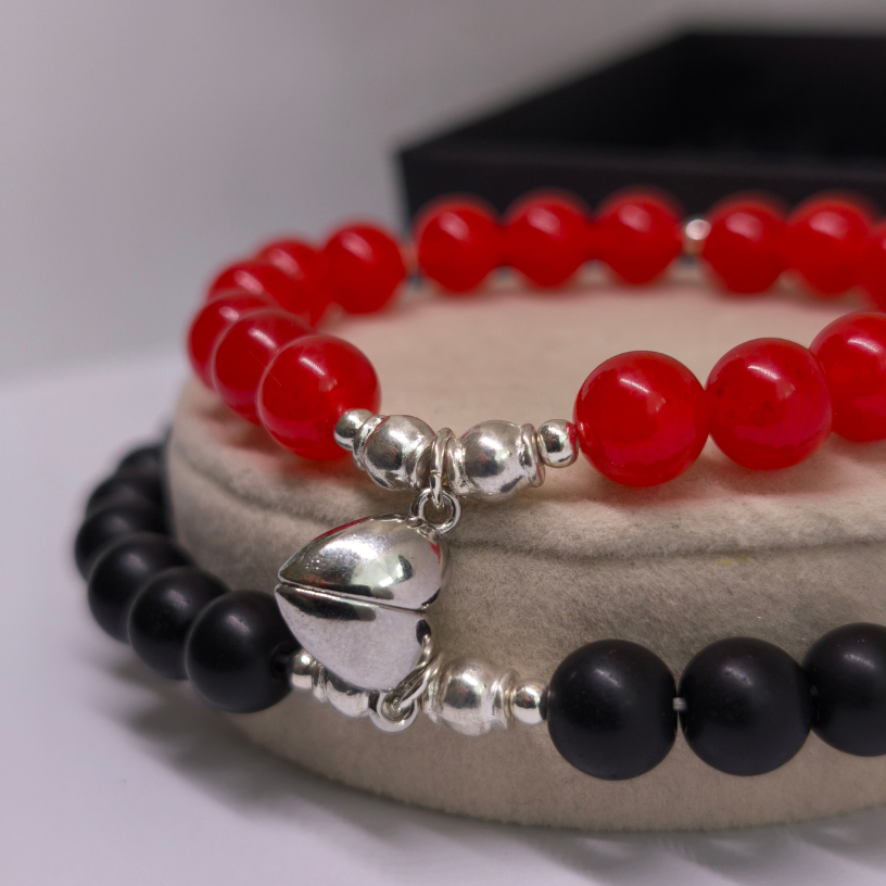 💞 Paaride käevõrude komplekt „Armastuse tõmme“ – need on ainulaadsed käsitsi valmistatud käevõrud, mis on loodud kahele teineteist armastavale inimesele. Punane käevõru on valmistatud looduslikust kaltsedoonist, mis sümboliseerib kirge, energiat ja südame tugevust, must käevõru aga šungiidist, mida tuntakse kui kaitse ja rahu kivi.