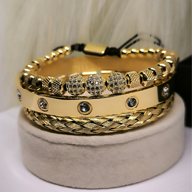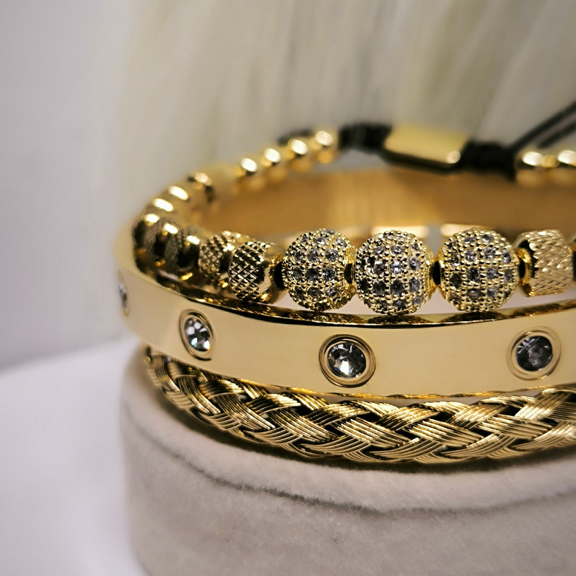 Kuldvärvi tsirkoonidega käevõrude komplekt meestele – luksus ja elegants ühes. Kvaliteetne roostevabast terasest aksessuaar, mis on niiskuskindel ja ei deformeeru. 2 kolmest käevõrust on reguleeritava suurusega. Käevõrude pikkus – 19 cm.