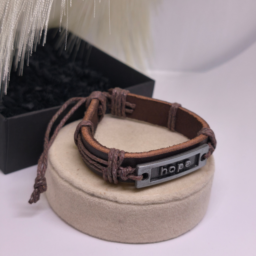 Valmistatud loodusliku naha imitatsioonist ja kaunistatud metallplaadiga, millel on kiri „hope“, see käevõru paistab silma oma tähenduse ja stiilse disainiga. Sooja pruuni värvi ja hõbedase aktsendi kombinatsioon loob harmoonilise, universaalse välimuse, mis sobib nii meestele kui naistele 👩‍❤️‍👨.