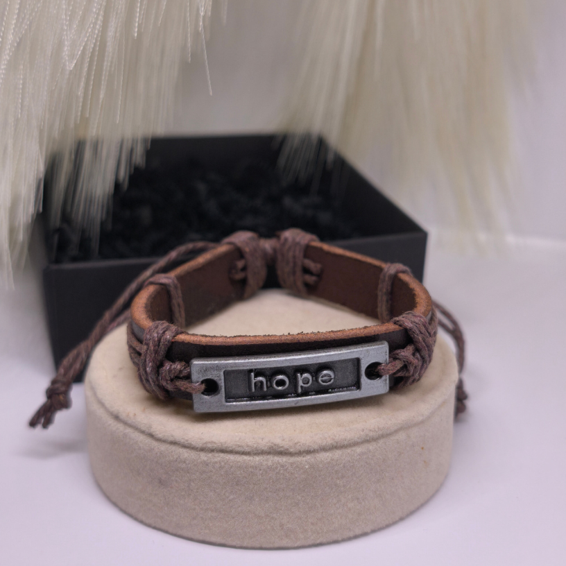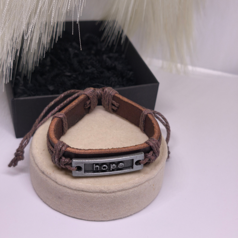 Käevõru „Hope“ – tähendusrikas aksessuaar, mis sümboliseerib lootust, tugevust ja usku endasse. Pruuni naha ja metalli kombinatsioon annab loomuliku stiili ja erilisuse tunde.