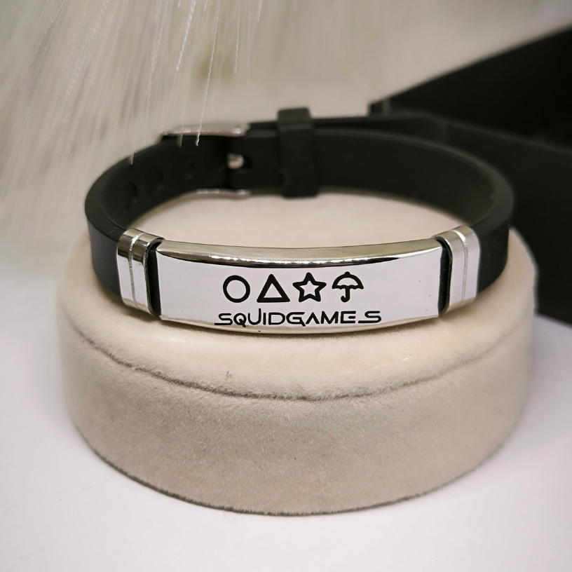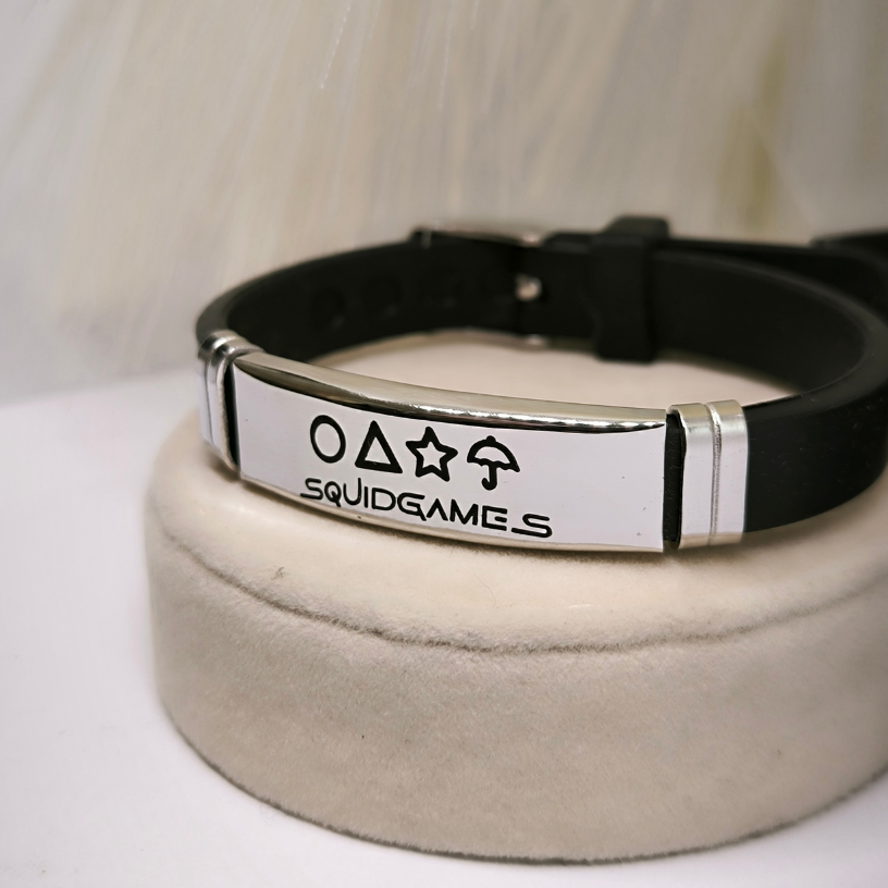 Käevõru “Squid Game” sarja fännidele, silikoonrihmaga ja reguleeritava kinnitusega. Valmistatud roostevabast terasest. Pikkus: 21 cm, kaal: 20 g.