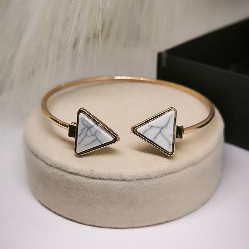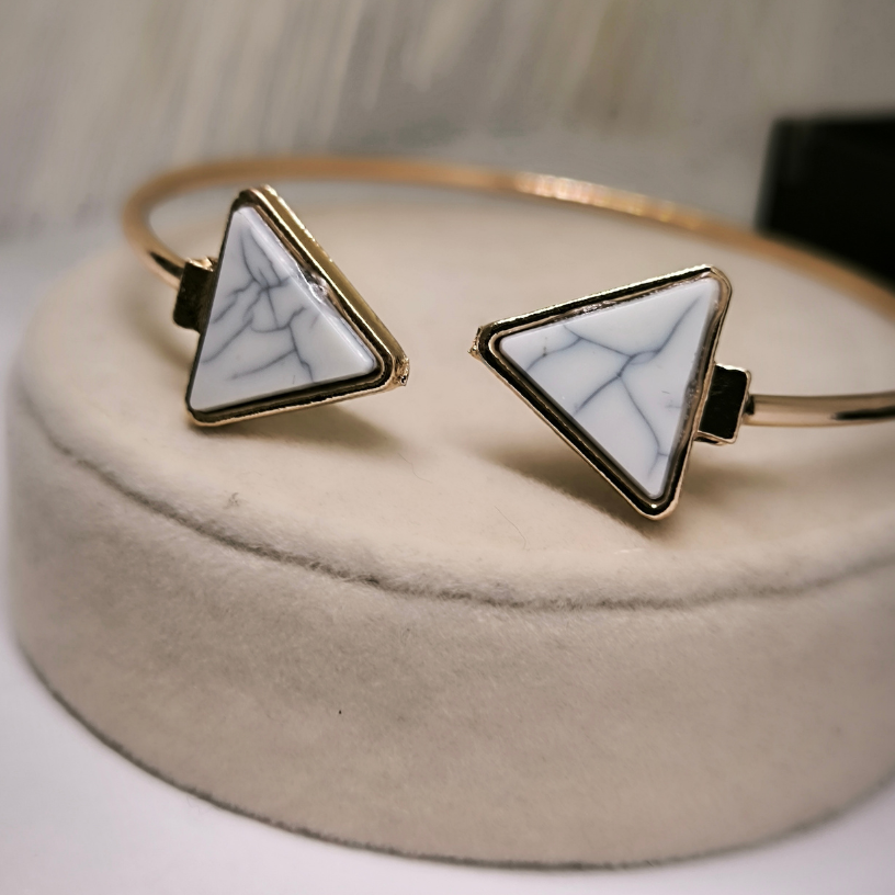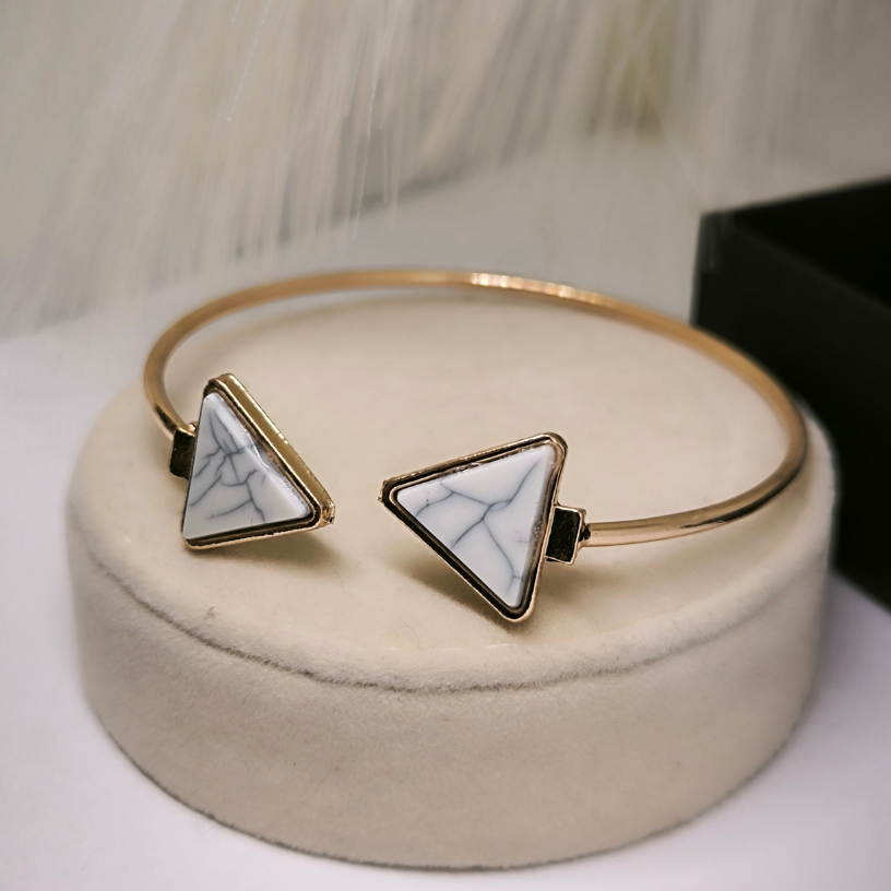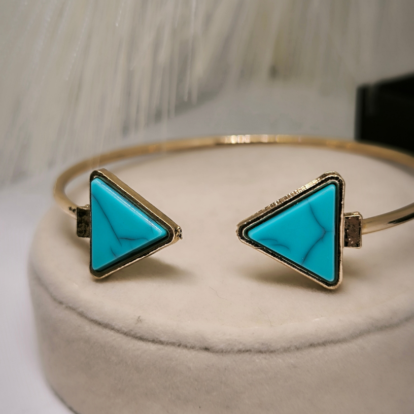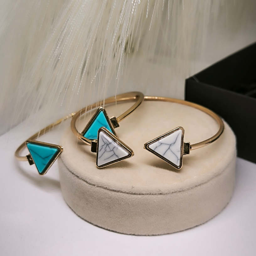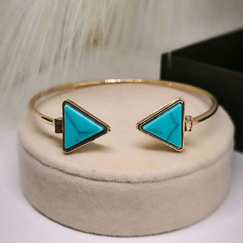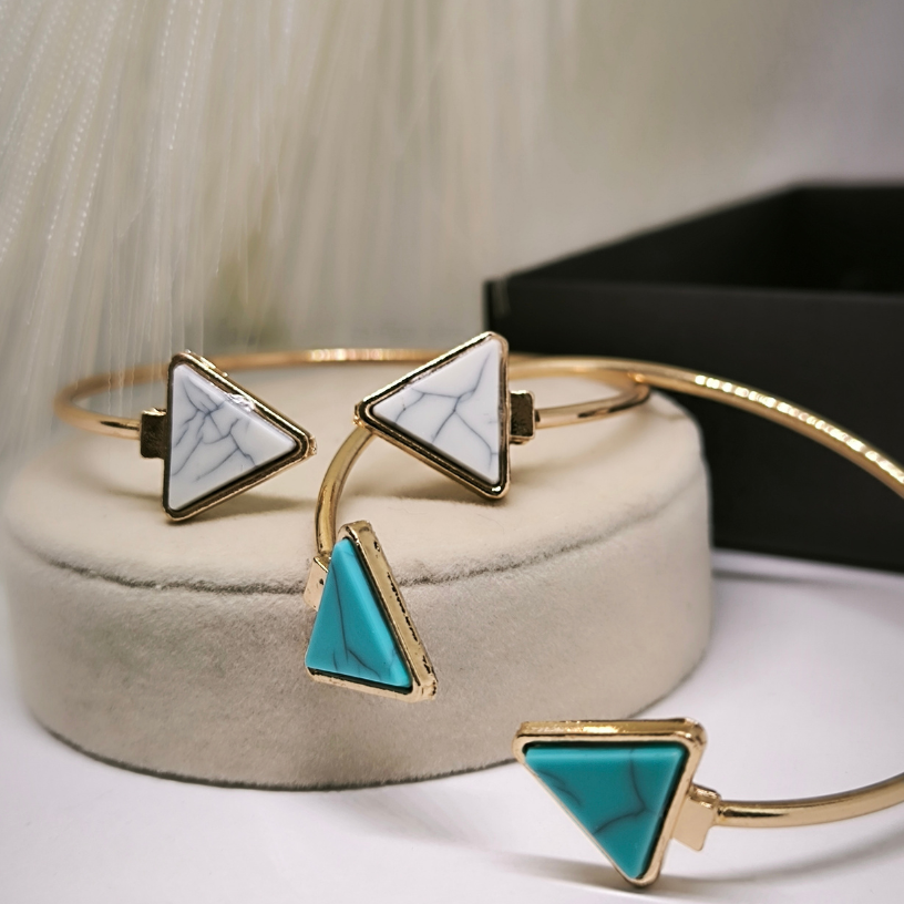 🌟 Otsite elegantset ja eristuvat ehte? Need kuldse värviga käevõrud kolmnurkadega on suurepärane valik naistele, kes hindavad stiili ja peenust. Sinine ja valge kivike, mis on asetatud kolmnurkadesse käevõru otstes, lisab ehtesele erilisust ja rafineeritust.