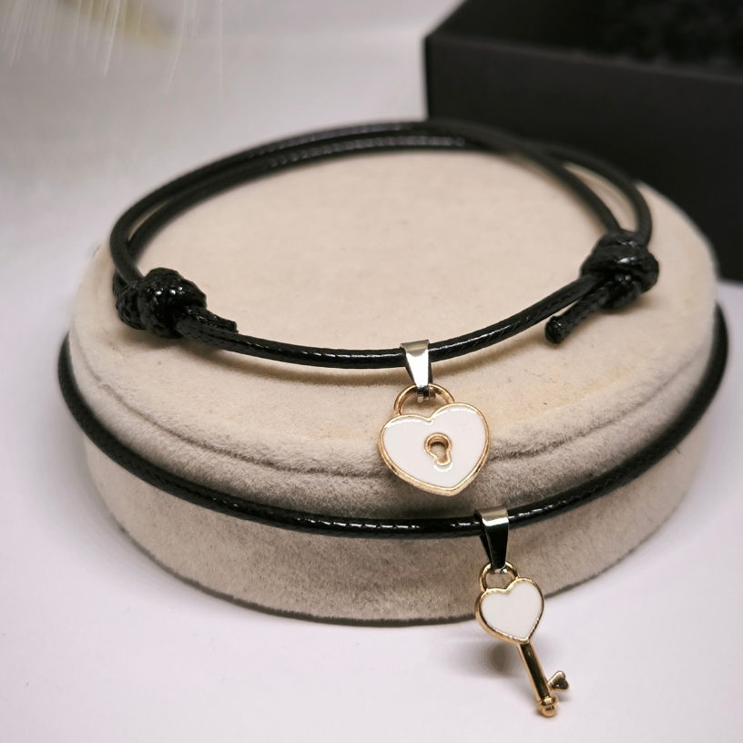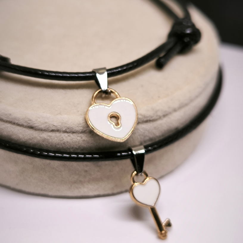 Paarile mõeldud käevõrude komplekt „Võti südamesse“ – armastuse ja läheduse sümbol! Valged helmed, sümboolsed ripatsid ja elegantne disain – suurepärane aksessuaar paaridele, kes soovivad näidata oma sidet!