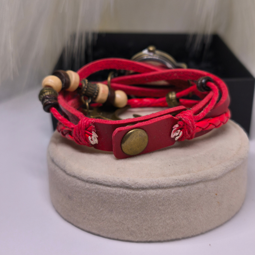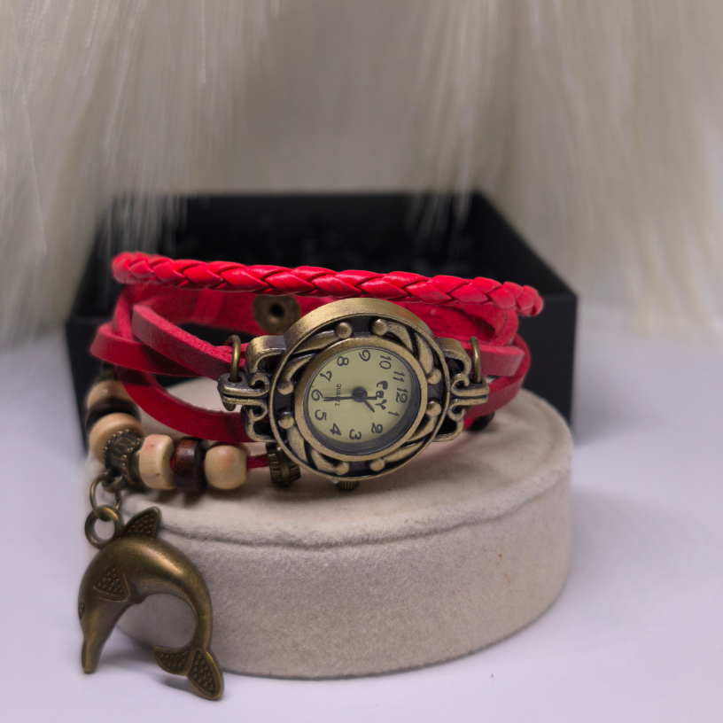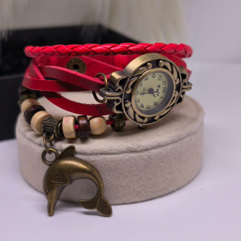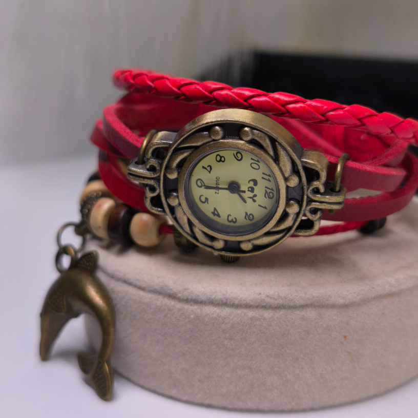 🐬 „Delfiini unenägu“ kell – see on unikaalne naiste aksessuaar, mis kiirgab suvisest kergusest ja vabaduse tundest. Erepunane nahkrihm sümboliseerib kirge ja energiat, samas kui delfiinikujuline ripats tuletab meelde unistusi, reise ja mere värskust. 🌊✨
