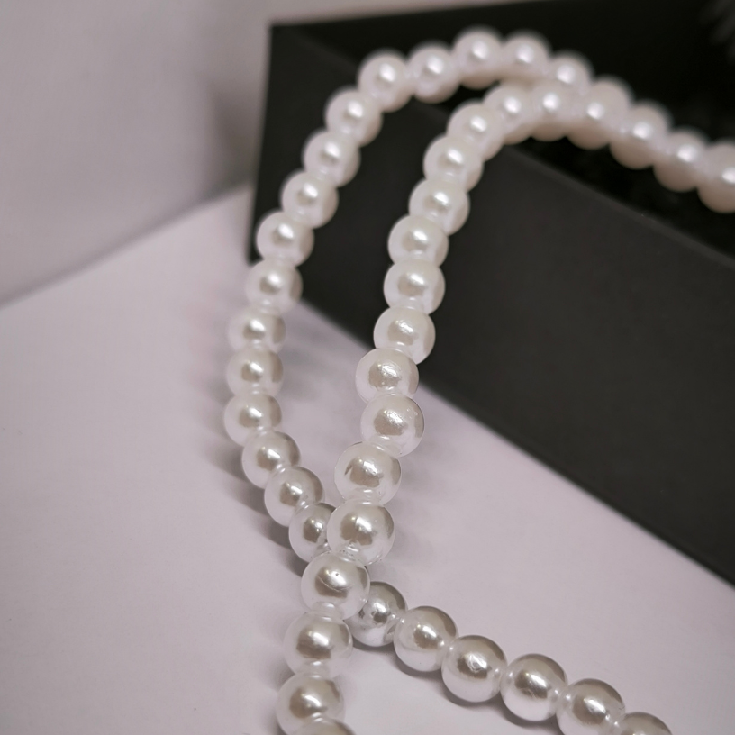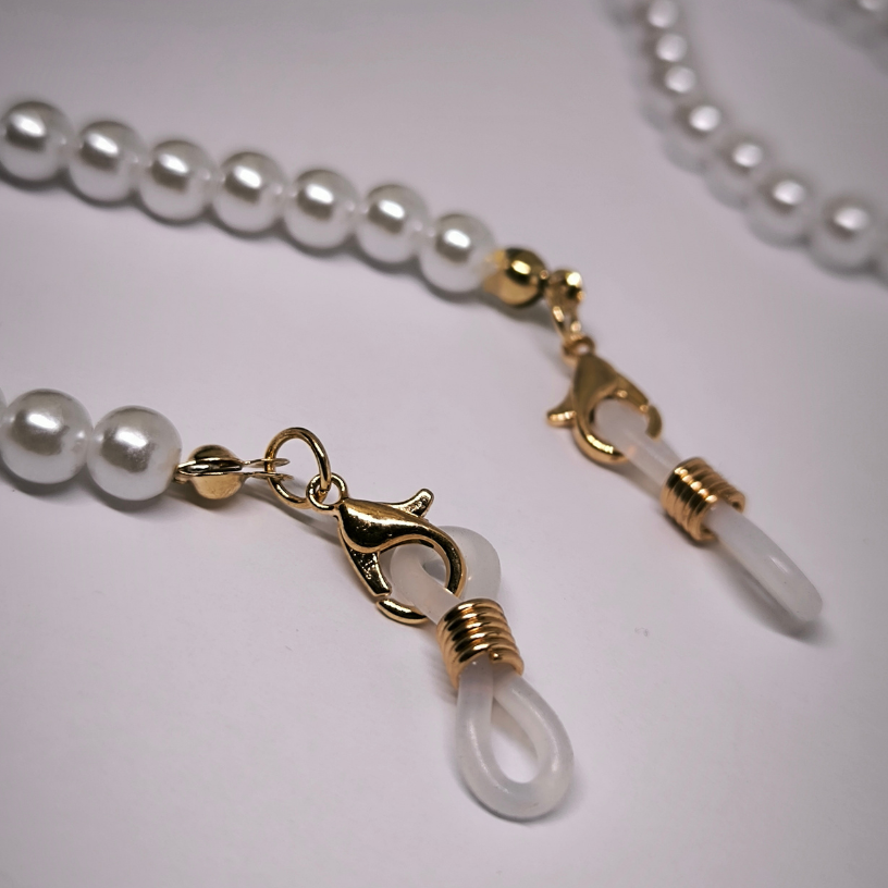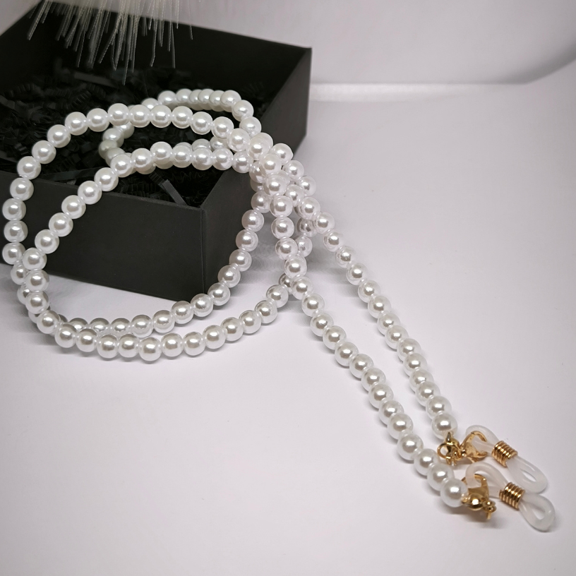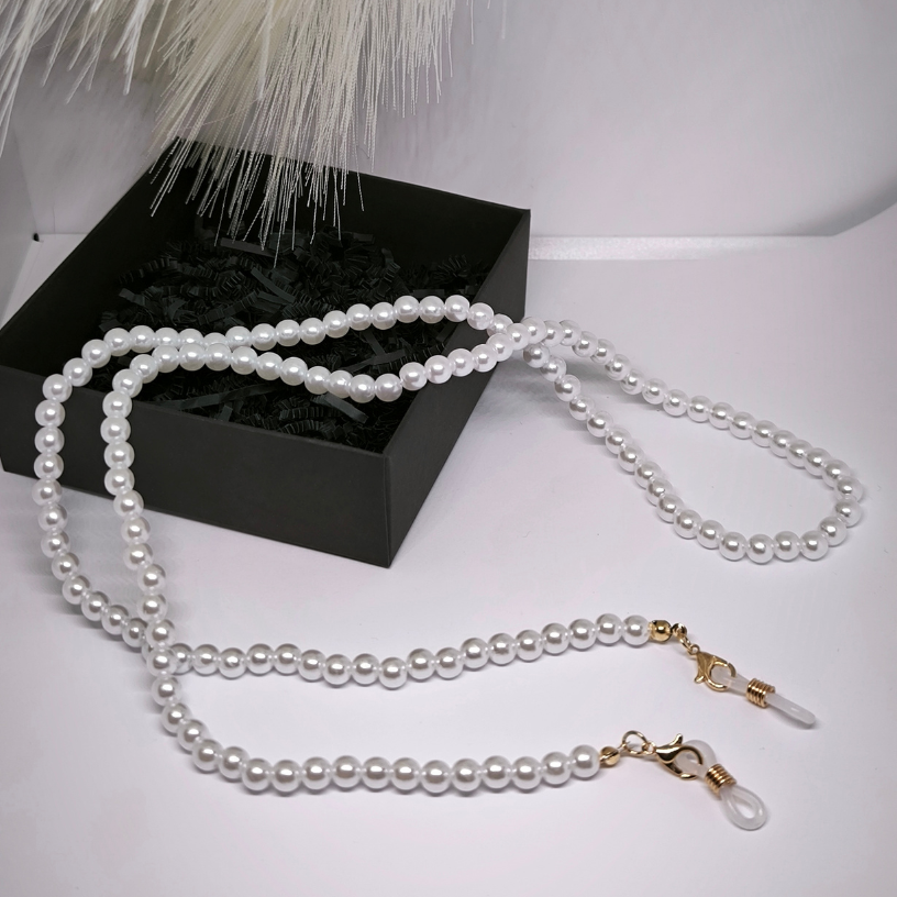 See kett on valmistatud elegantsetest valgete pärlite imitatsioonidest, mis säravad valguses ja sobivad suurepäraselt igasuguste prillidega – lugemisprillidest päikeseprillideni. Kuldse värvi detailid lisavad ehtesele veelgi luksuslikkust. ✨