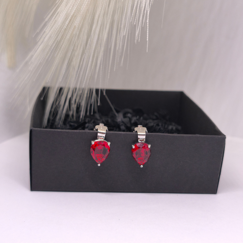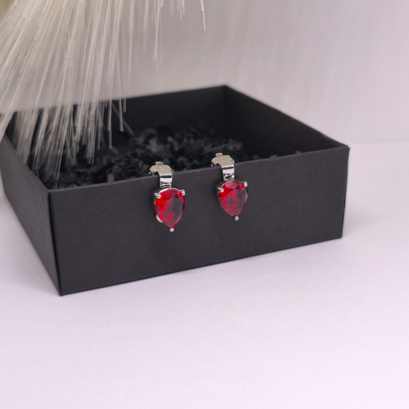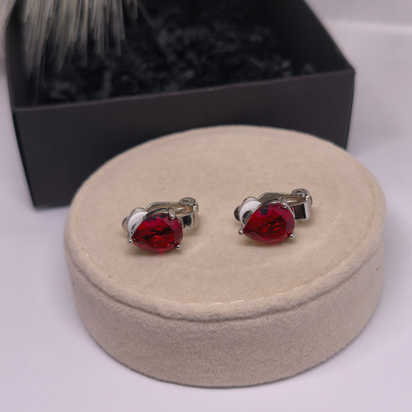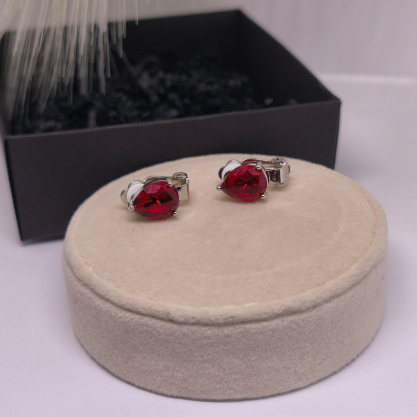 Väljendusrikkad klips-kõrvarõngad „Punased tilgad“ sügavpunase tilgakujulise kiviga – elegantne valik naistele, kes soovivad oma stiilile lisada kirge ja luksust.