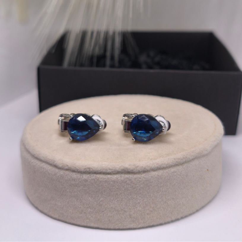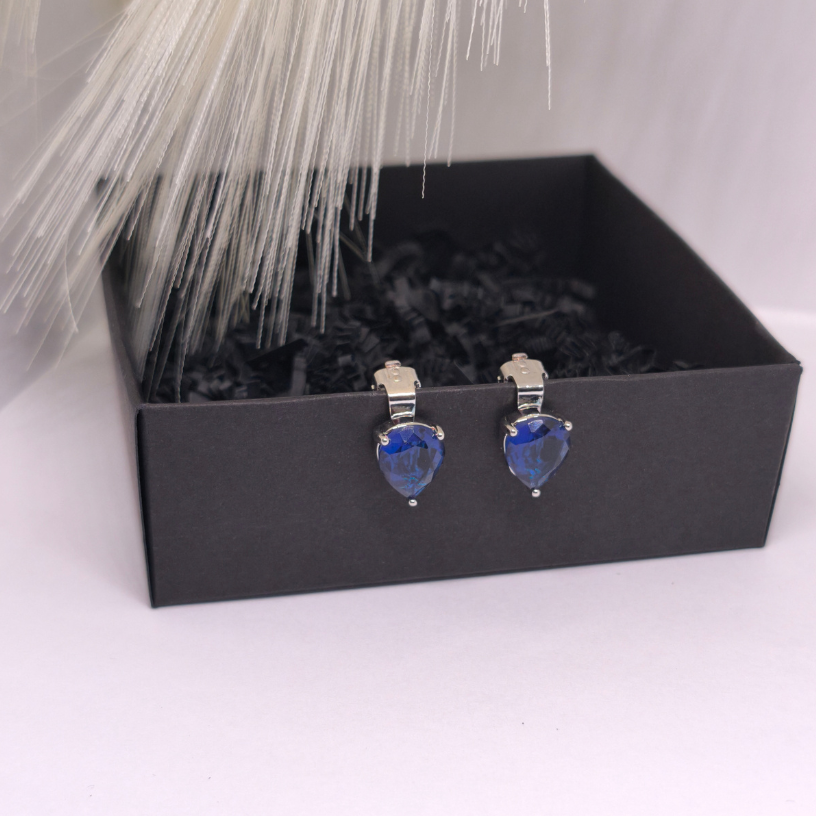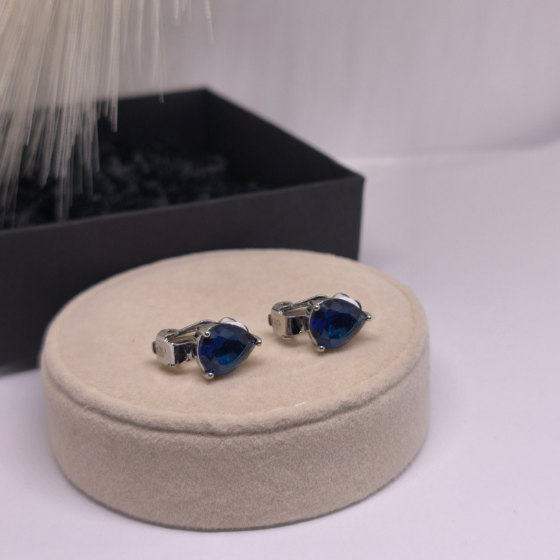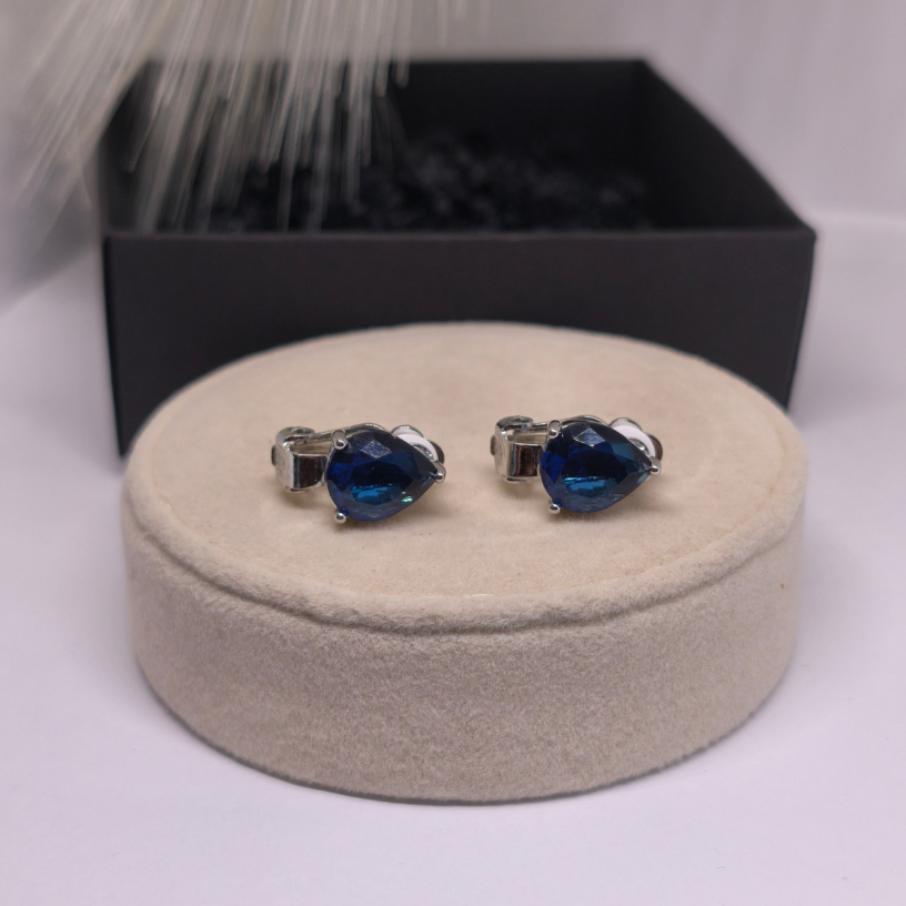 Elegantne klõpsuga kõrvarõngad „Safiiritilk“ sügavsinise tilgakujulise kiviga – peen valik naistele, kes hindavad klassikalist ilu, salapära ja mugavust.