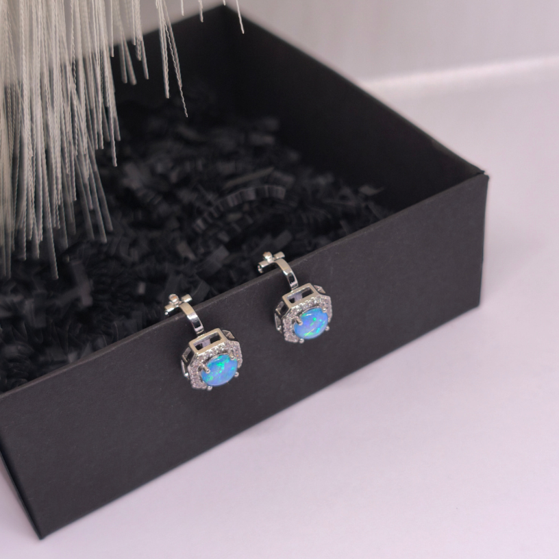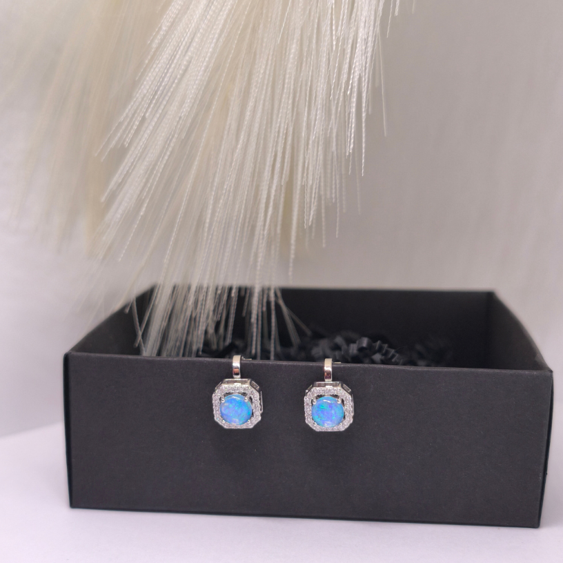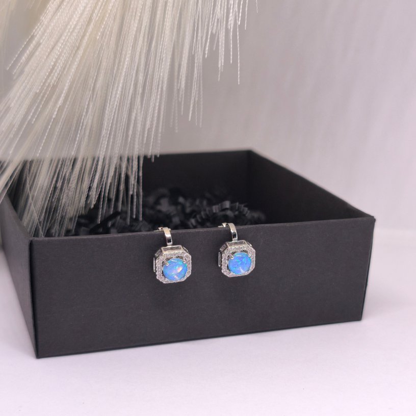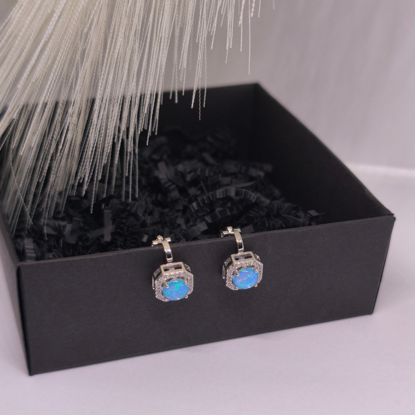 Keskmine opaliseeriv sinakas kivi võlub oma unikaalse värvimänguga – sõltuvalt valgusest muudab see peenelt toone, meenutades taeva miraaži. Kivi ümbritsevad väikesed sädelevad kristallid, mis lisavad kõrvarõngastele rafineeritud luksust ja täiuslikkust.
