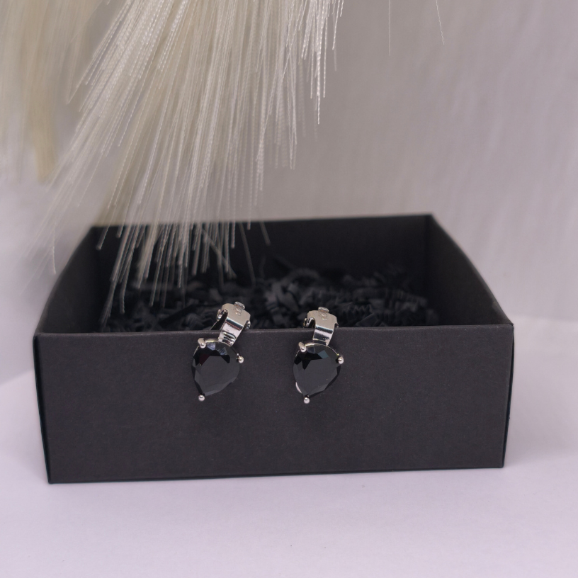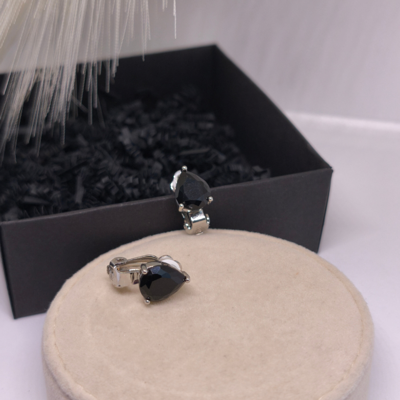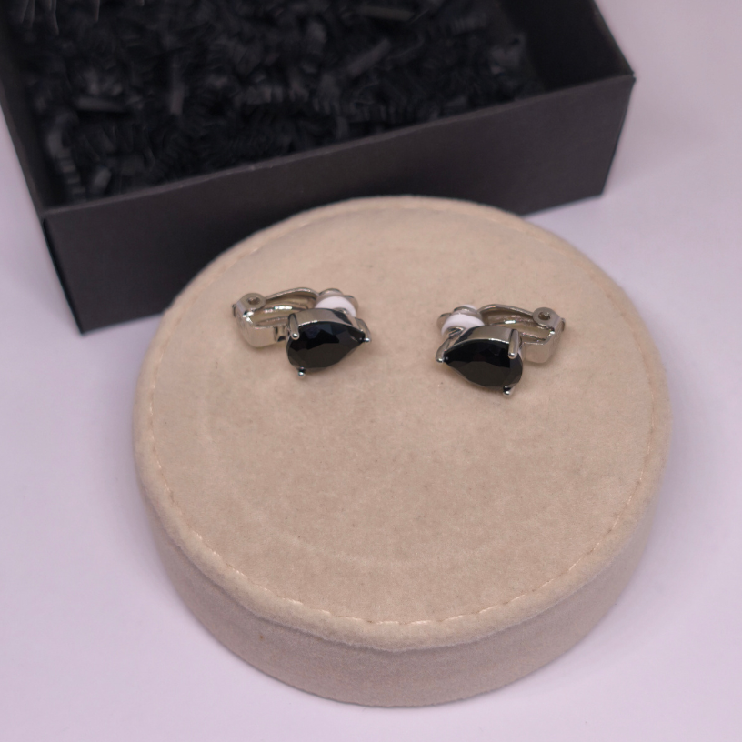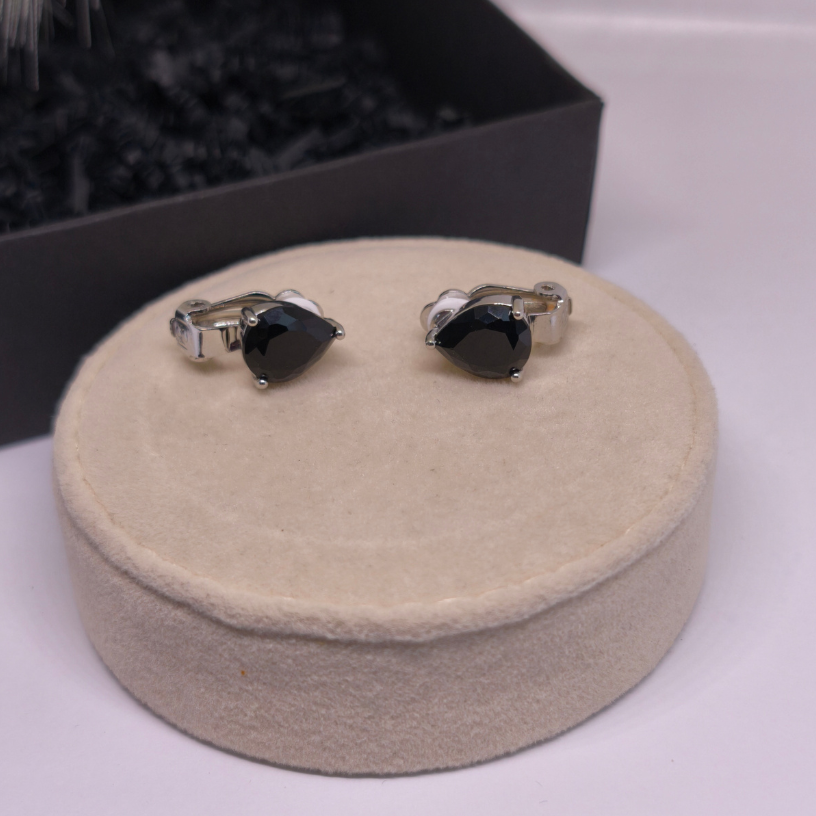 Elegantne kõrvarõngad-klipid „Pisara“ musta pisarakujulise kiviga – peen ja stiilne valik naistele, kes hindavad klassikat, mugavust ja erakordset disaini.