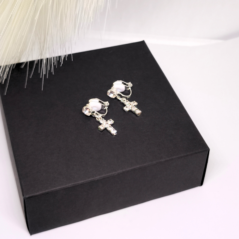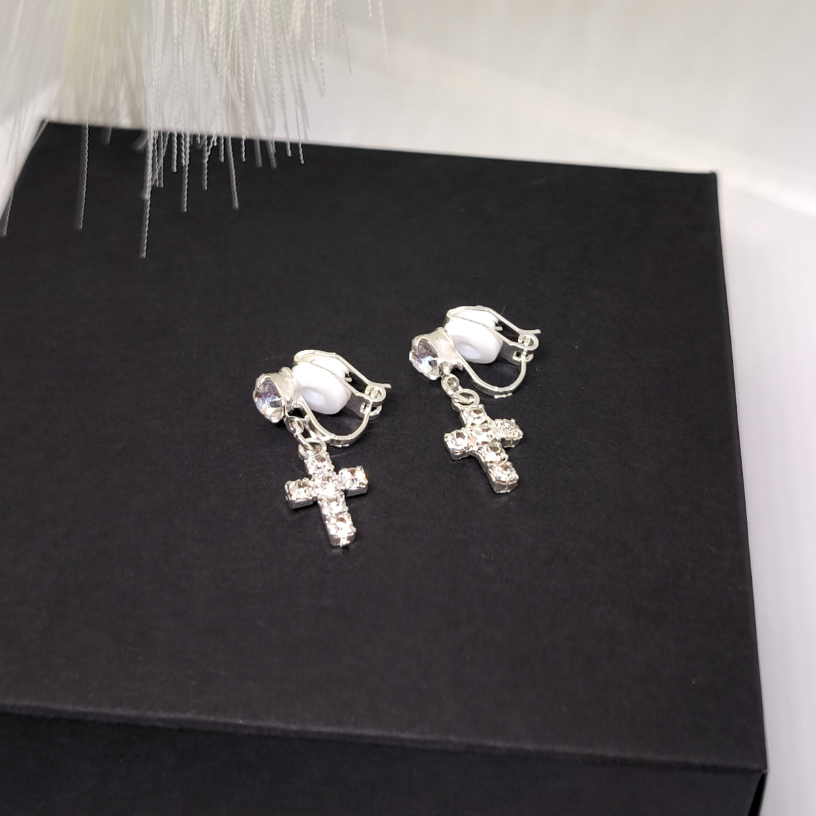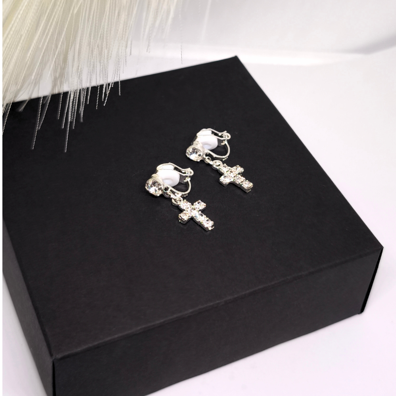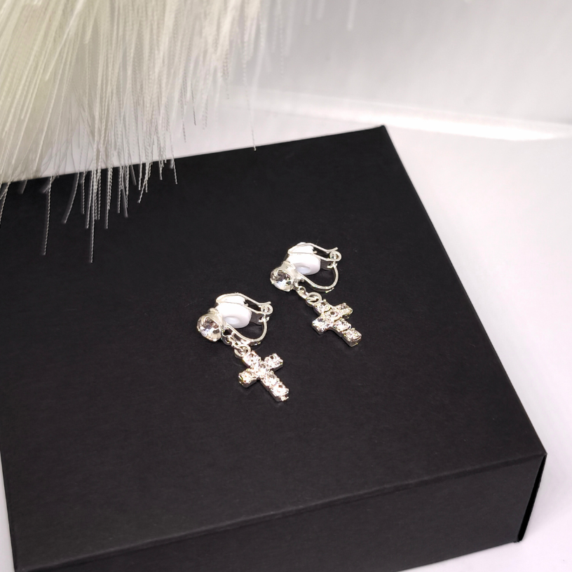 Hõbedased detailid lisavad modernsust, samas kui ristakujuline ripats on moodne aktsent, mis täiendab suurepäraselt nii igapäevast kui ka õhtust välimust 🌙. Klipsid sobivad suurepäraselt ka neile, kellel pole kõrvaauke — kinnitus on õrn, mugav ja ohutu.