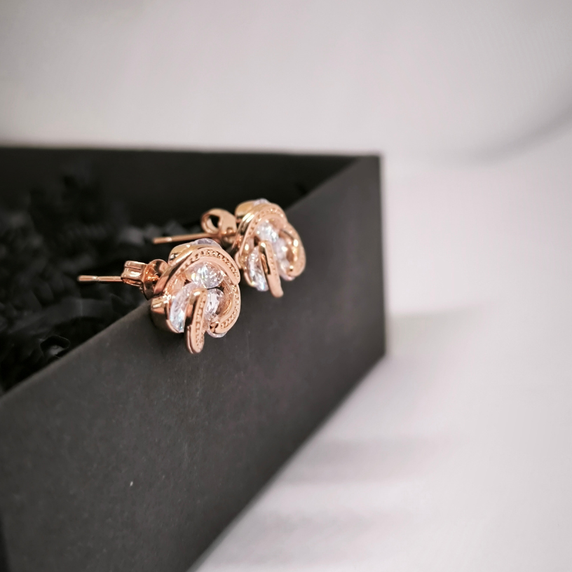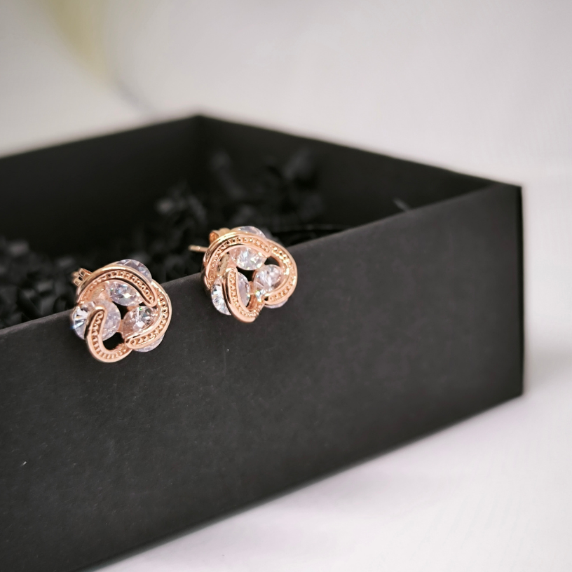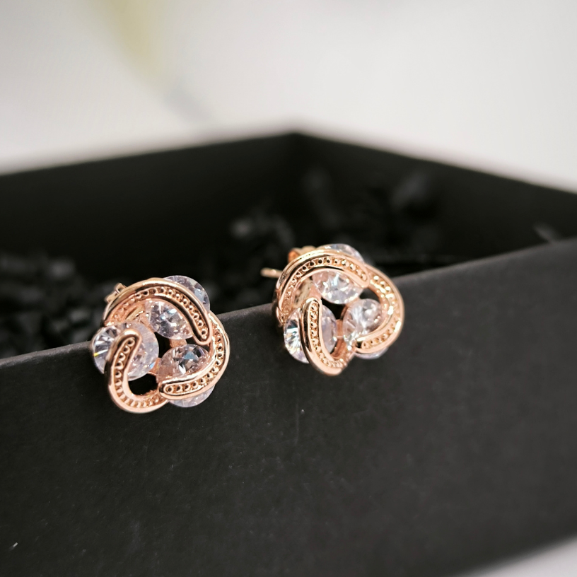 Roosa kulla värvi kõrvarõngad kolme särava tsirkoonkristalliga – peen ja luksuslik aksessuaar, mis lisab elegantsi igale sündmusele. Suurepärane valik piduliku välimuse jaoks.